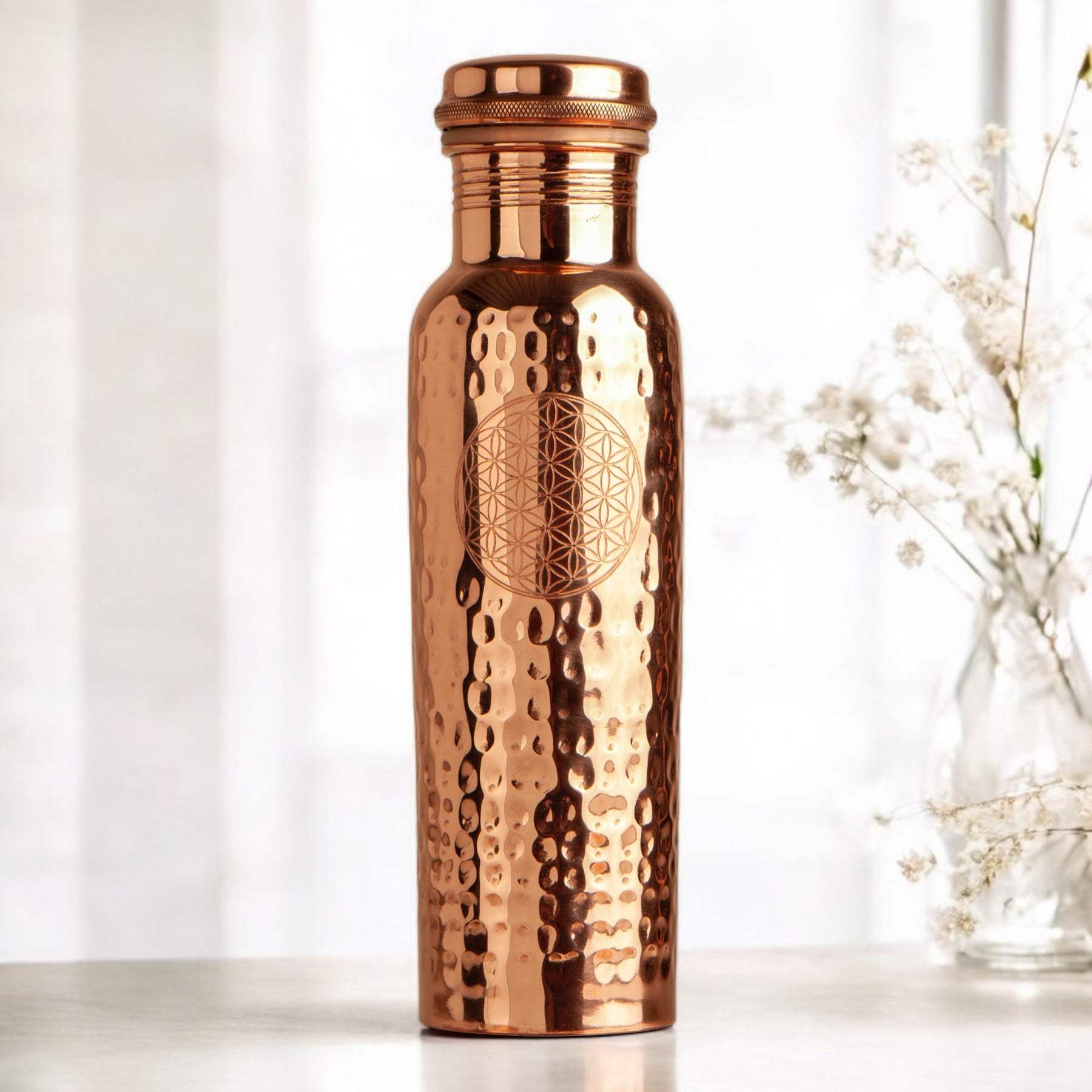 Diese handgehämmerte Kupferflasche mit eingravierter Blume des Lebens ist ein ganz besonders wertvoller Schatz für alle, die es lieben, reines und energetisch hochwertiges Wasser zu jeder Zeit zu trinken.