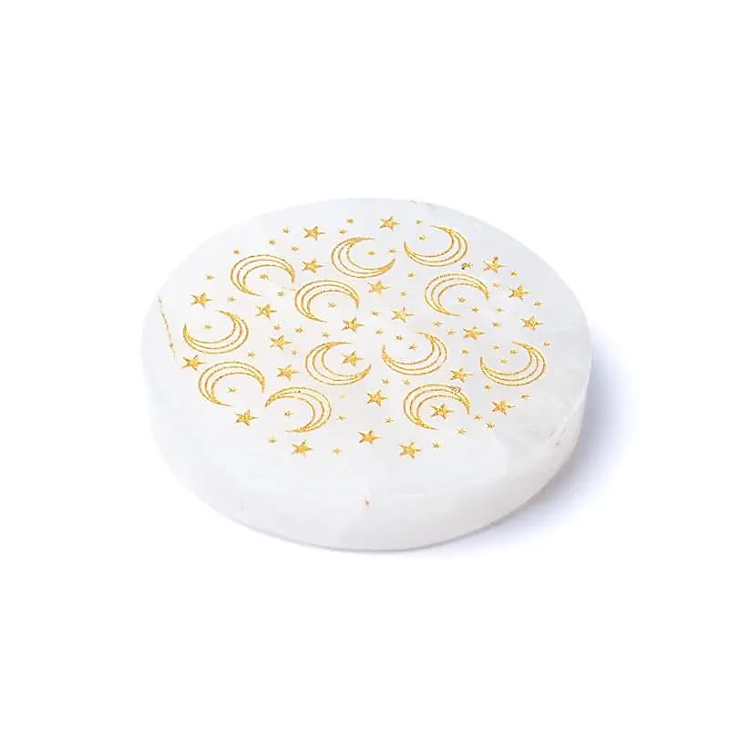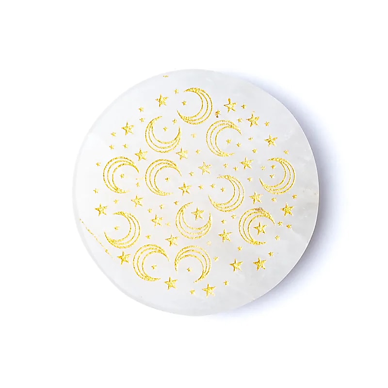 Bezaubernde Bergkristallscheibe mit Halbmond- und Sternenmuster, perfekt für den Altar oder als Talisman zum Mitnehmen!