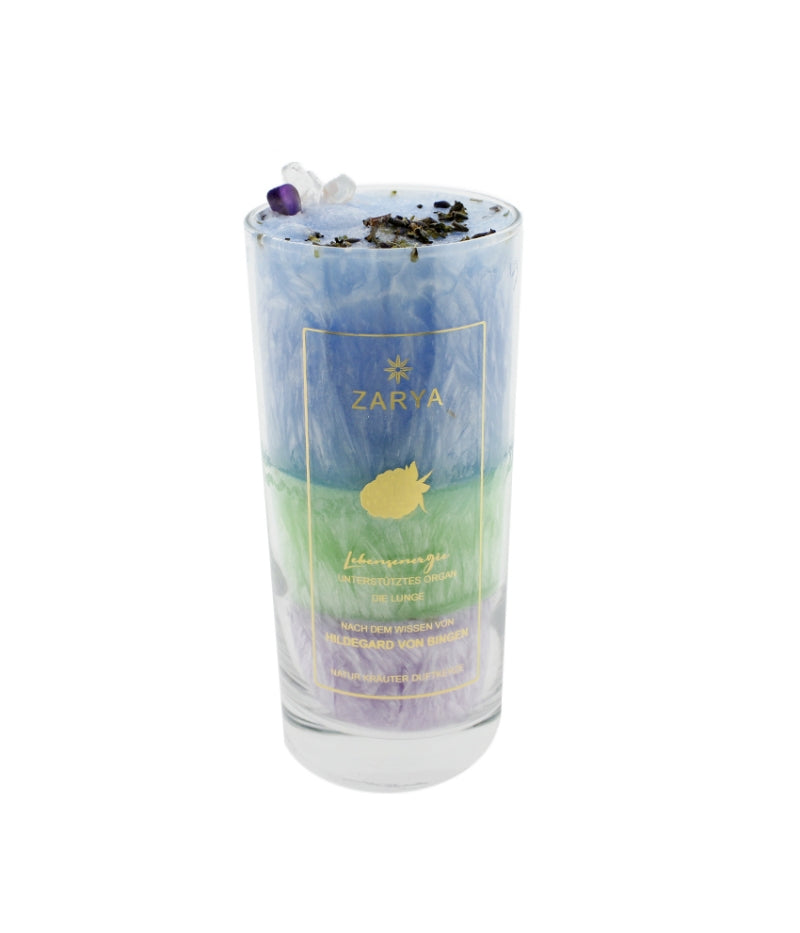 Diese Heilkräuterkerze vereint das Wissen der Hildegard von Bingen, die Heilsteine der Organuhr und die Prinzipien der Aromatherapie. Durch das Anzünden dieser Ritualkerze wird die eigene Lebensenergie und auch gleichzeitig „die Lunge“ unterstützt. Auf der spirituellen Ebene ist die Lunge für die Lebensenergie, die zwischenmenschliche Kommunikation sowie die seelische Zuwendung verantwortlich. Sie nimmt das Qi über die Atmung auf, die uns mit der ganzen Welt verbindet. Dadurch liegt die Lungenenergie allen Atemrhythmen zugrunde, die unser Leben bestimmen. Auf der körperlichen Ebene trägt die Lunge die Hauptlast der Körperabwehr vor Krankheitserregern. Solange die Lunge stark ist, bleiben wir gesund.