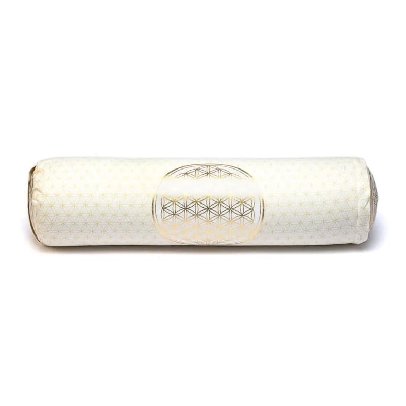 Die Yogi & Yogini Nackenrolle mit Blume des Lebens Druck, Innen- und Außenbezug aus 100 % Bio-Baumwolle, gefüllt mit natürlicher Buchweizenspreu. 6 % des gesamten Bolsters sind organisch. Organic Content Standard (OCS Blended) zertifiziert.(*)