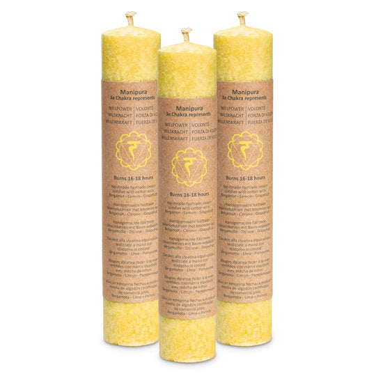 Chakra Duftkerze Manipura 3. Chakra gold-gelb mit den Aromen: Bergamotte, Zitrone, Grapefruit.