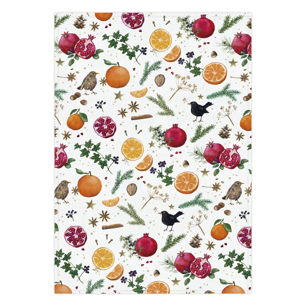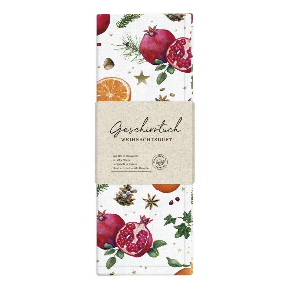 Mit dem Geschirrtuch „Weihnachtsduft“ bringst du festliche Stimmung in deine Küche! Die liebevoll gestaltete Illustration von Daniela Drescher verzaubert dich mit weihnachtlichen Motiven wie Granatäpfeln, Orangen, Zweigen und kleinen Vögeln. Aus 100 % Baumwolle gefertigt und in Europa hergestellt, vereint dieses Tuch Qualität und Stil in perfekter Harmonie. Es ist nicht nur praktisch, sondern auch ein dekoratives Highlight, das dir das Gefühl von Wärme und Geborgenheit schenkt – ideal, um die Vorfreude auf die Feiertage in deinem Zuhause zu verbreiten.