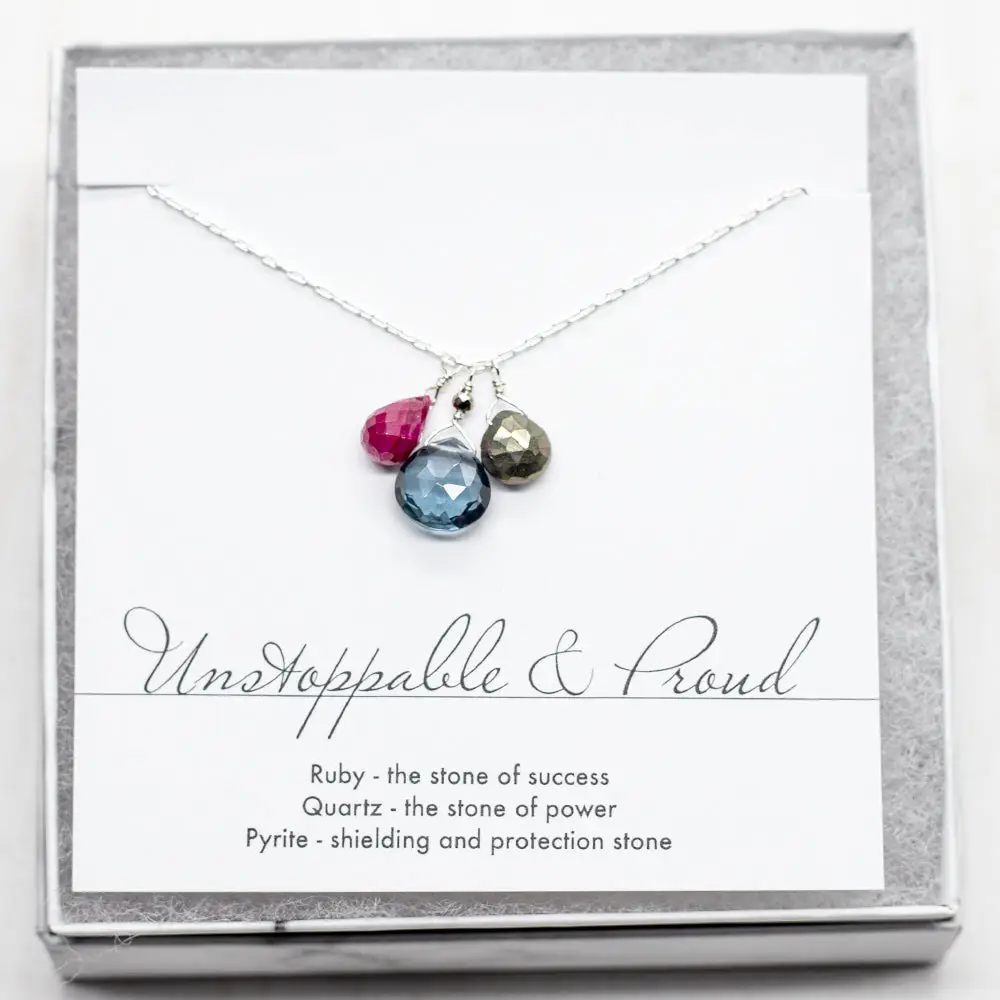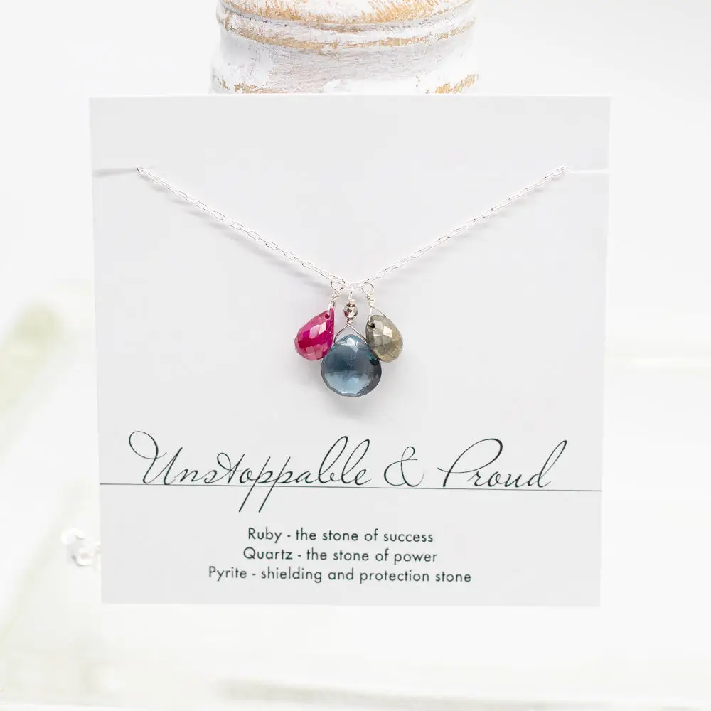 Unstoppable and Proud - unaufhaltsam und stolz ist eine wundervolle Halskette aus Silber. Dem Rubin wird nachgesagt, dass er einer der stärksten Heilsteine für die Liebe und Sexualität ist. Denn er wirkt vitalisierend und macht dynamisch. Blauquarz verleiht Gelassenheit und Vitalität. Pyrit löst Ängste und Blockaden.