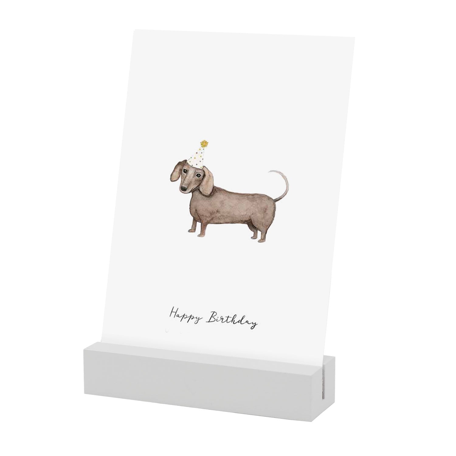 Happy Birthday Postkarte mit Dackel in Aquarellfarben gemalt und gedruckt. Egal, ob du die Karte an ein Geburtstagsgeschenk hängen willst, mit der Post versenden oder es zum dekorieren nutzen - es zaubert immer Konfetti für die Seele! Diese Postkarten werden im Digitaldruckverfahren auf 400g matt lackiertem Papier gedruckt. Die Rückseite ist blanko mit einem kleinen Eulenschnitt-Logo verziert, so dass du noch viel Platz zum Beschreiben der Karte vorfindest.