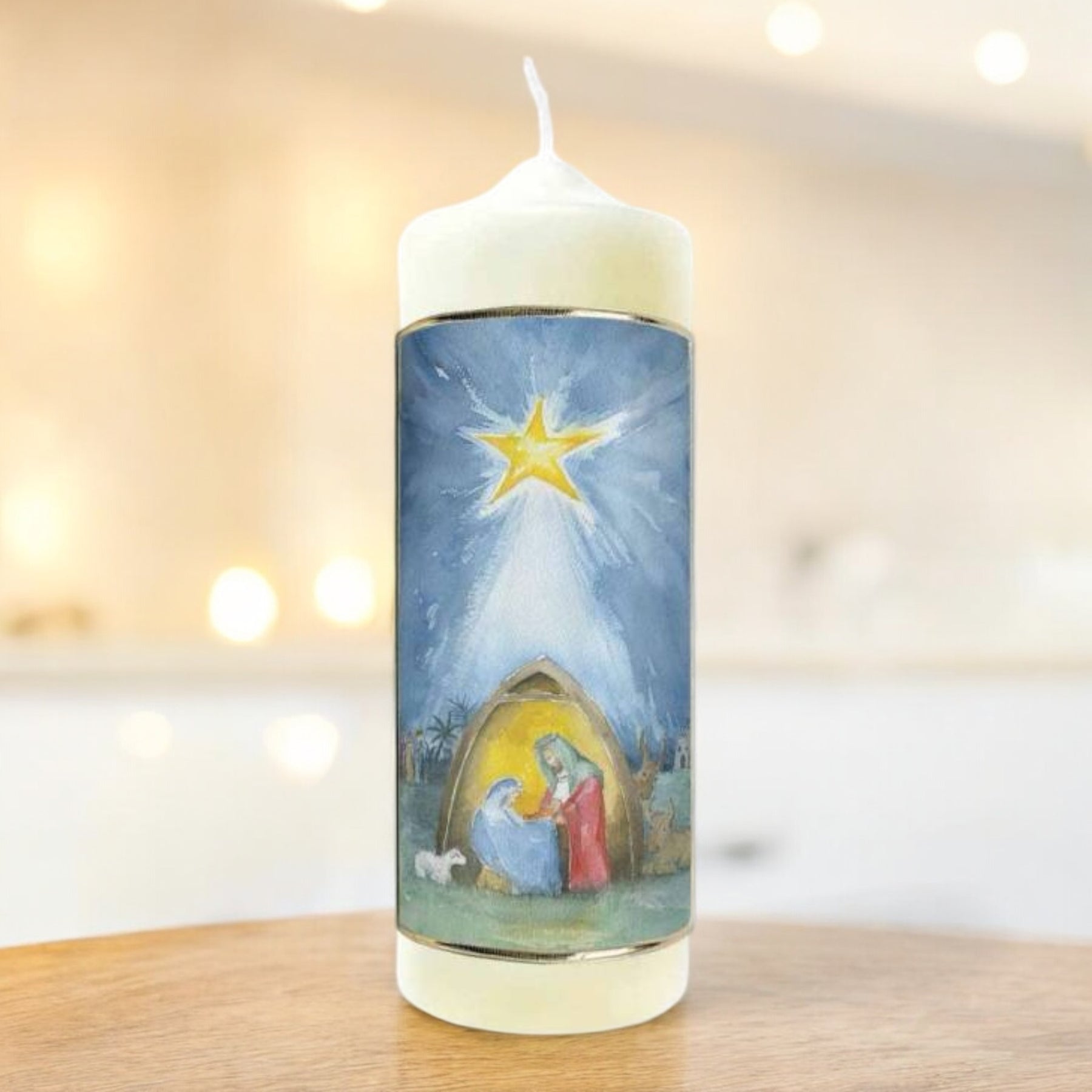 Lass den Weihnachtsfrieden in dein Zuhause einziehen mit dieser liebevoll gestalteten Kerze. Der wunderschöne Druck zeigt das Christuskind in der Krippe, umgeben von Maria und Josef, unter dem leuchtenden Morgenstern, der den Weg weist. Diese stimmungsvolle Darstellung erinnert an den Beginn von etwas Wunderbarem und bringt Wärme und Besinnlichkeit in die Advents- und Weihnachtszeit.