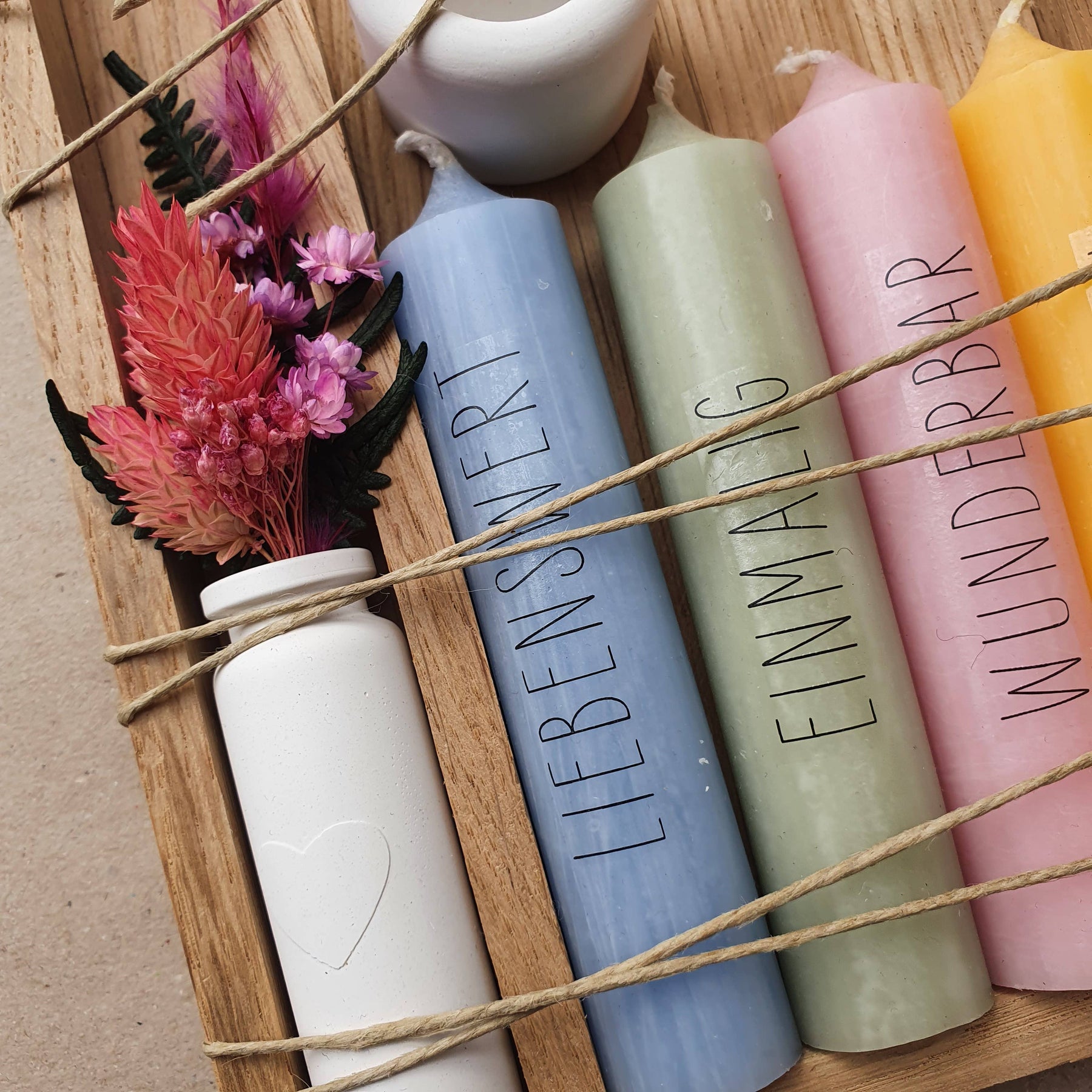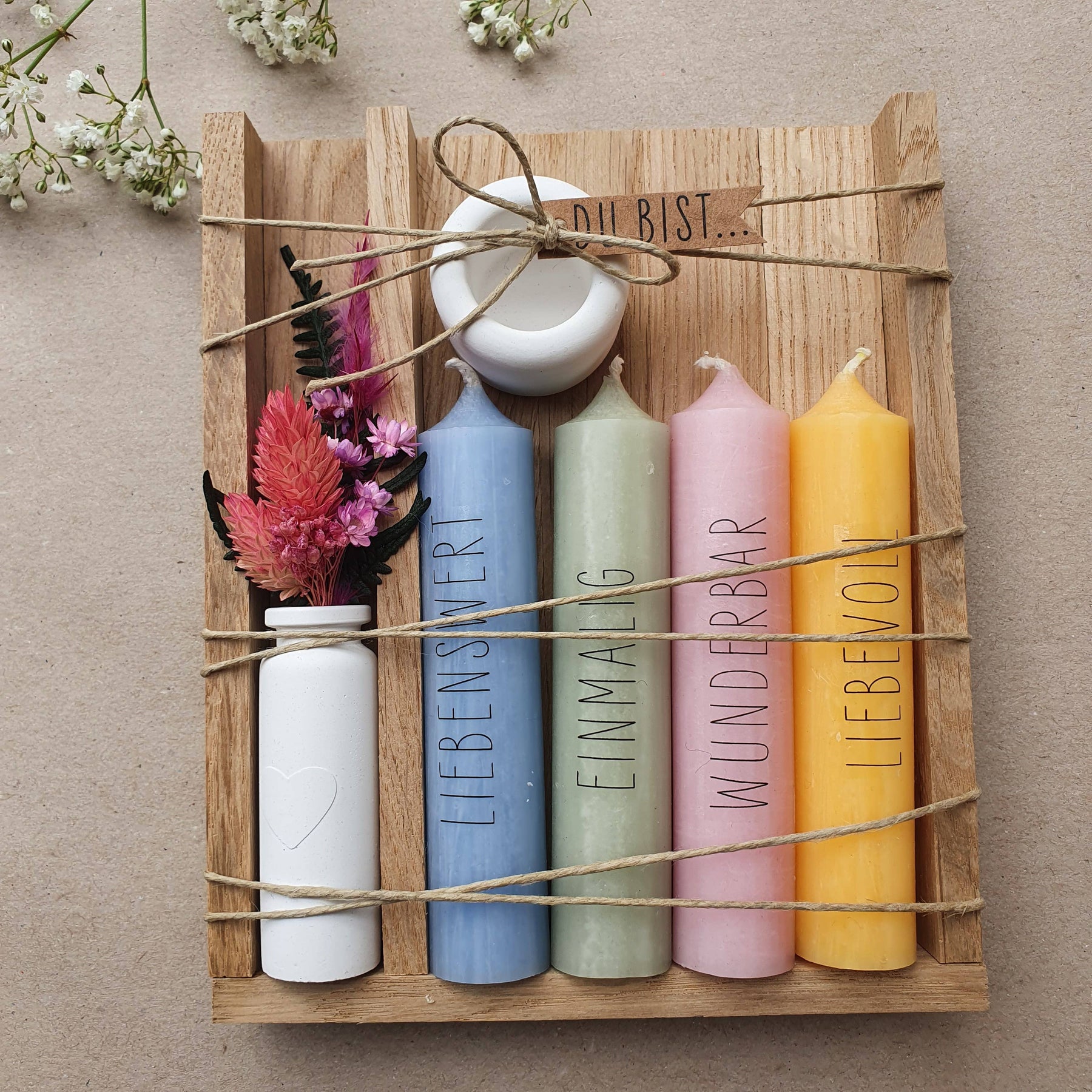 Das Set enthält vier Kerzen in sanften Pastelltönen (je ca. 10 cm lang, Ø 22 mm), einen passenden Kerzenhalter und eine kleine Vase mit zauberhaften Trockenblumen. Verpackt in einer stilvollen Holzbox, umwickelt mit Jutegarn und einem Kraftpapier-Schild, ist es eine herzliche Geste voller Wertschätzung.