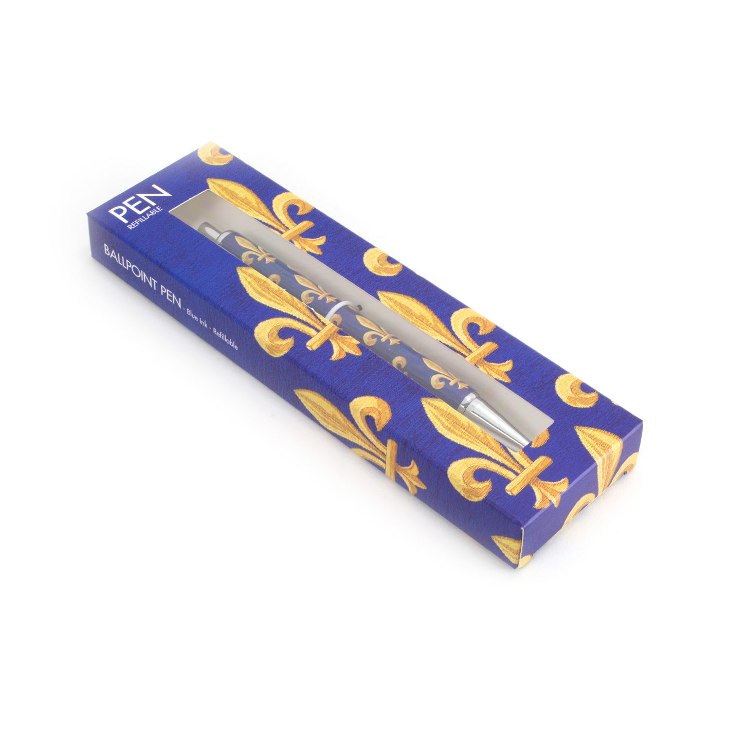 Dieser edle Kugelschreiber ist ein stilvoller Begleiter für Alltag und Büro. Das Gehäuse zeigt das klassische Fleur-de-Lys-Motiv und verleiht dem Schreibgerät eine elegante Note. Mit blauer Tinte und angenehmem Schreibfluss verbindet er Funktionalität mit Design.