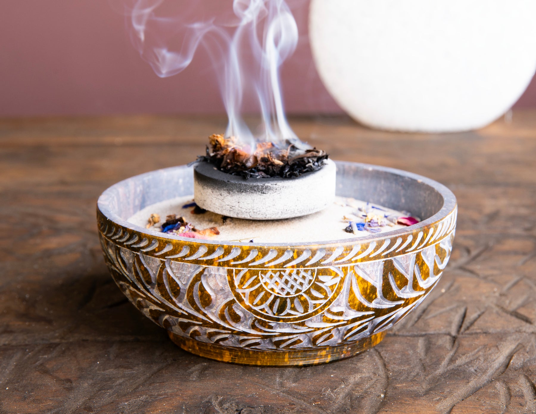Kunstvoll geschnitzt aus hochwertigem Speckstein bringt die Schale Ruby mit ihrem orientalischen Design Wärme und Atmosphäre in Deine Räucherrituale.