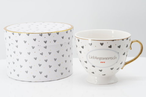 Großer Henkelbecher "gold" für Ihren Lieblingsmenschen im wunderschönen runden Geschenkkarton mit Goldrand und Herzchen wie auf der Tasse. Oder ein Geschenk für sich selbst. Hieraus trinken sich hervorragend Kakao, Tee, Kaffee......