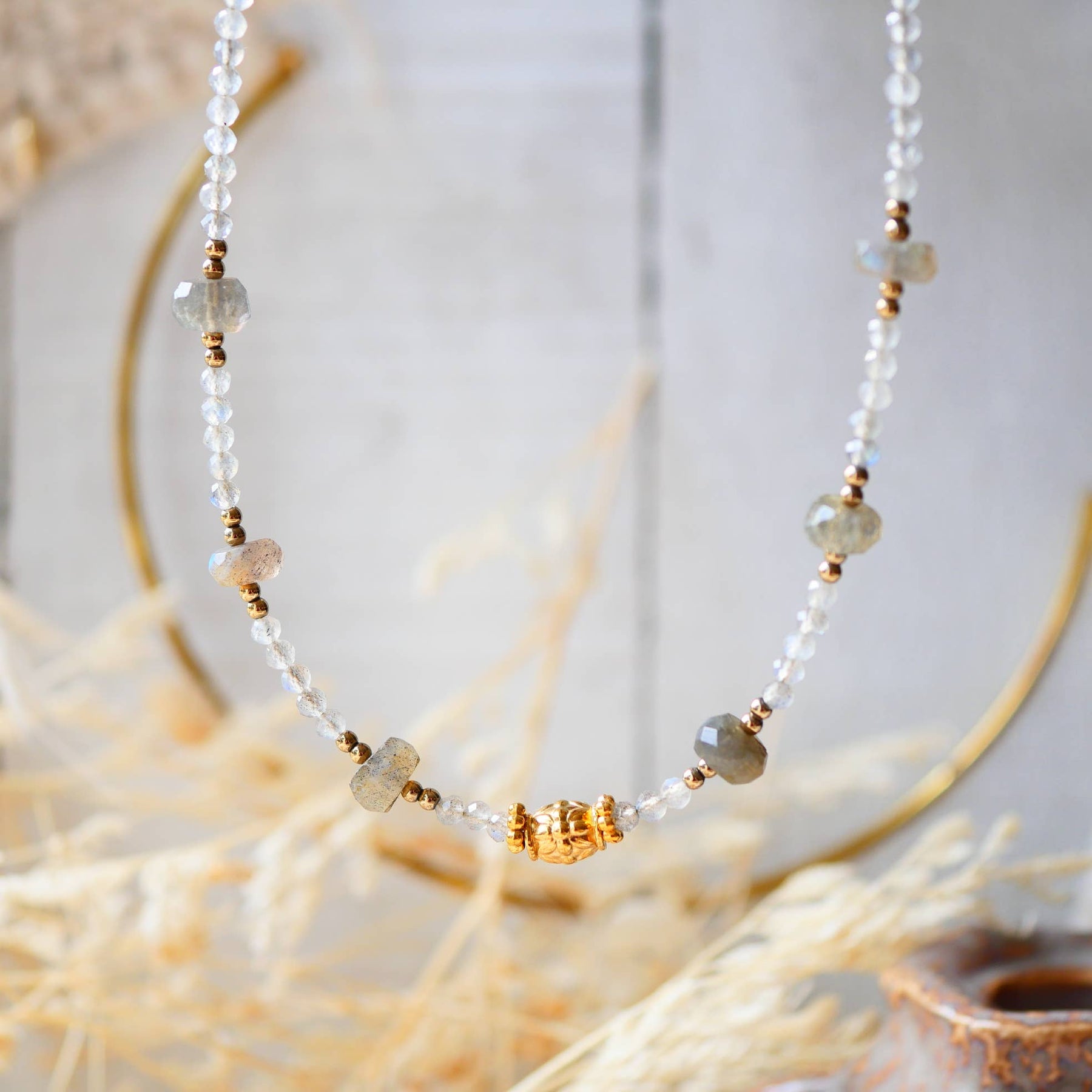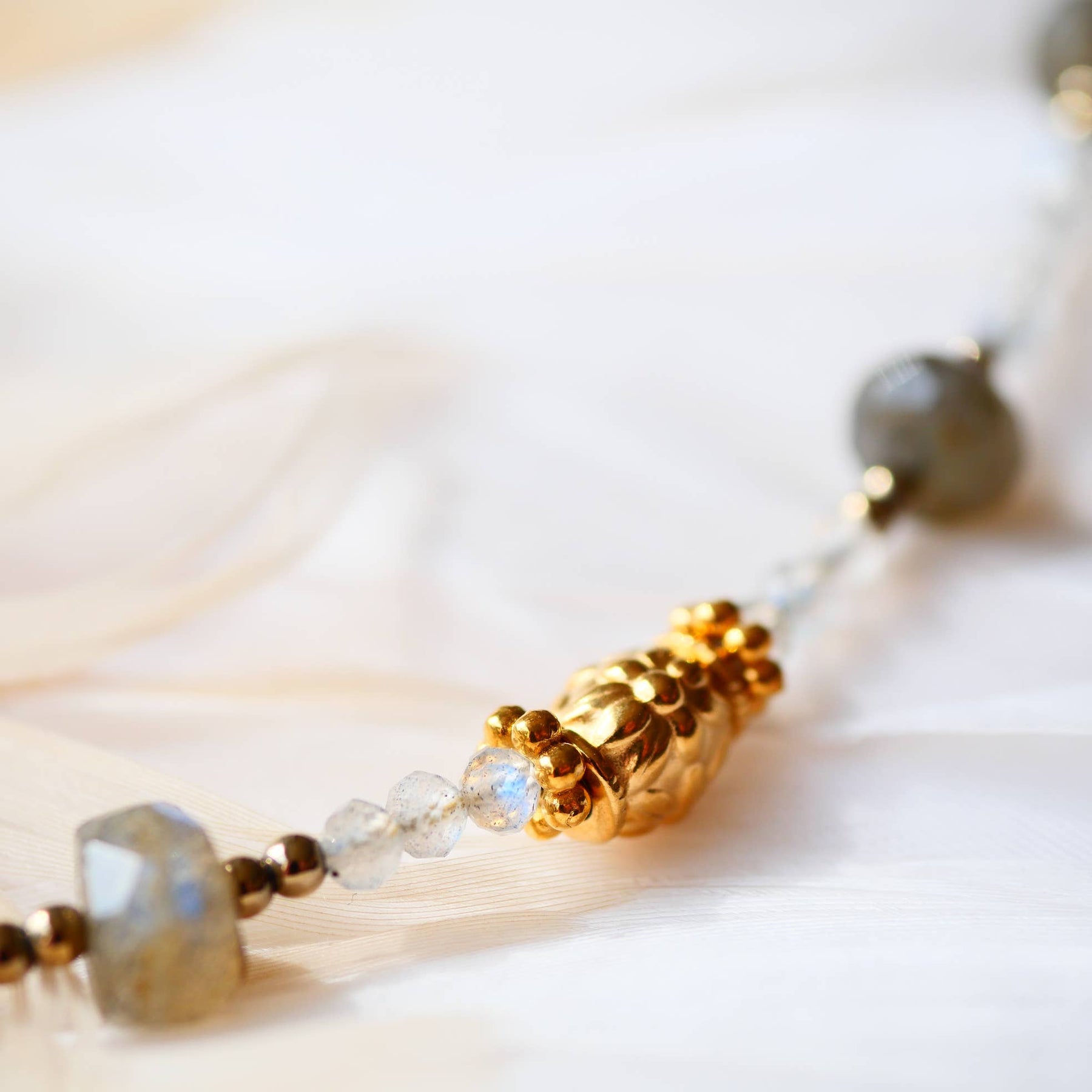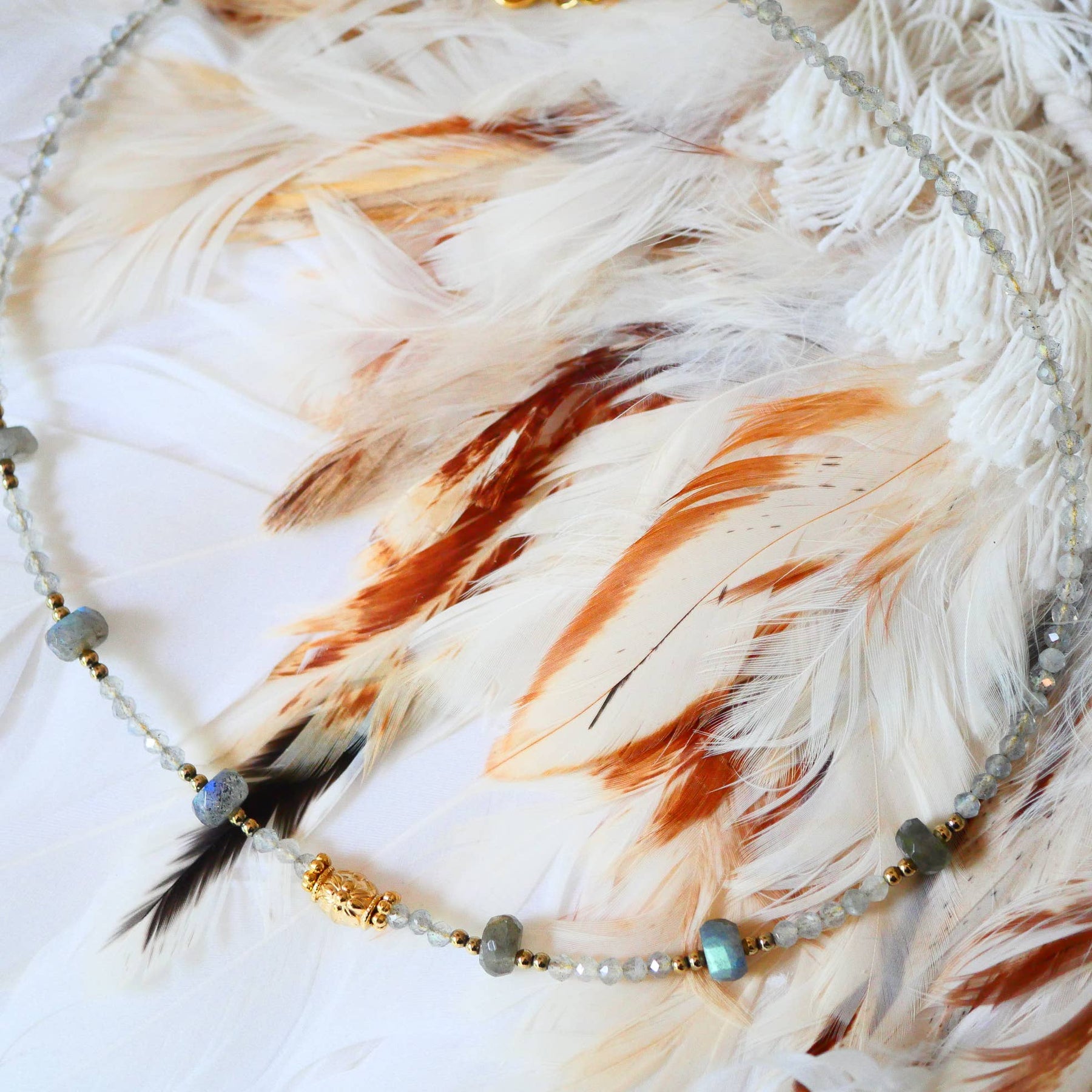 CHETNA Halskette aus Edelstahl mit Labradorit und zentralem Talisman. Schutz, Intuition und spirituelle Verbindung. Die CHETNA Halskette ist ein kraftvolles Schmuckstück, das sich auf Labradorit und einen Talisman konzentriert. Labradorit stärkt die Intuition und schützt, während der Talisman eine spirituelle und persönliche Dimension hinzufügt.