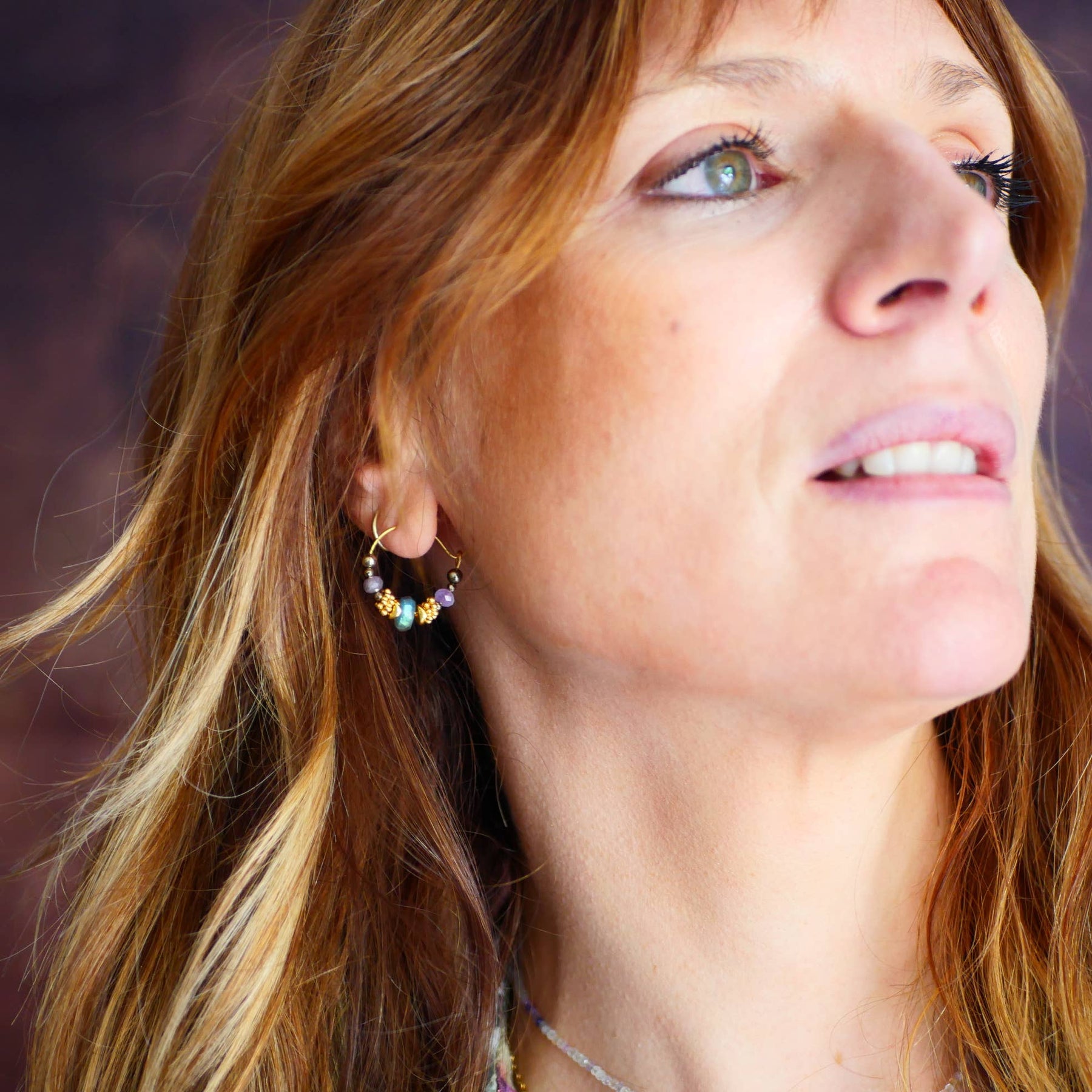 Diese handgefertigten Ohrringe vereinen schlichte Eleganz mit natürlichen Akzenten: zarte Edelstahl-Creolen (Ø 2 cm) schmücken sich mit echten Edelsteinen – darunter schimmernder Labradorit, tiefvioletter Amethyst und fein gearbeitete Charms im Boho-Stil. Jeder Stein ist ein Unikat – so wird jedes Paar zu etwas ganz Besonderem.