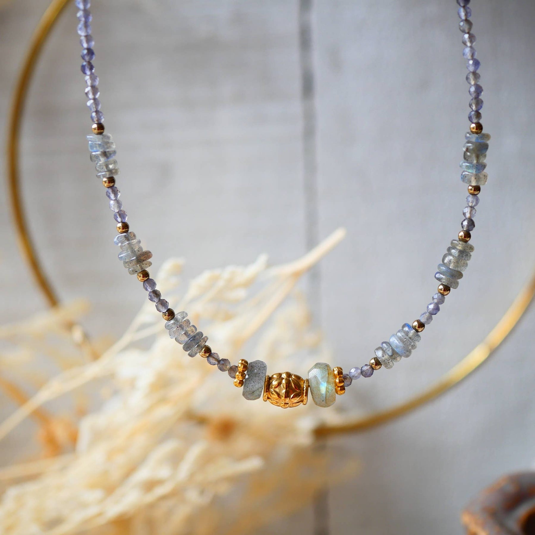 SWAR Halskette aus Edelstahl mit Iolith, Labradorit und zentralem Talisman. Mentale Klarheit, Intuition und spirituelle Verbindung. Die SWAR Halskette kombiniert Iolith für mentale Klarheit und Labradorit für Intuition, mit einem zentralen Talisman für tiefe spirituelle Verbindung.