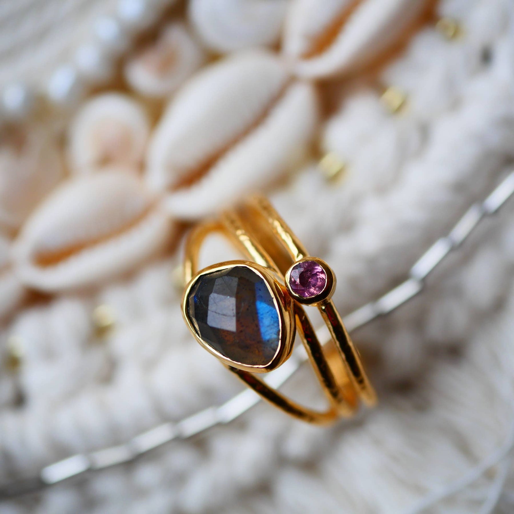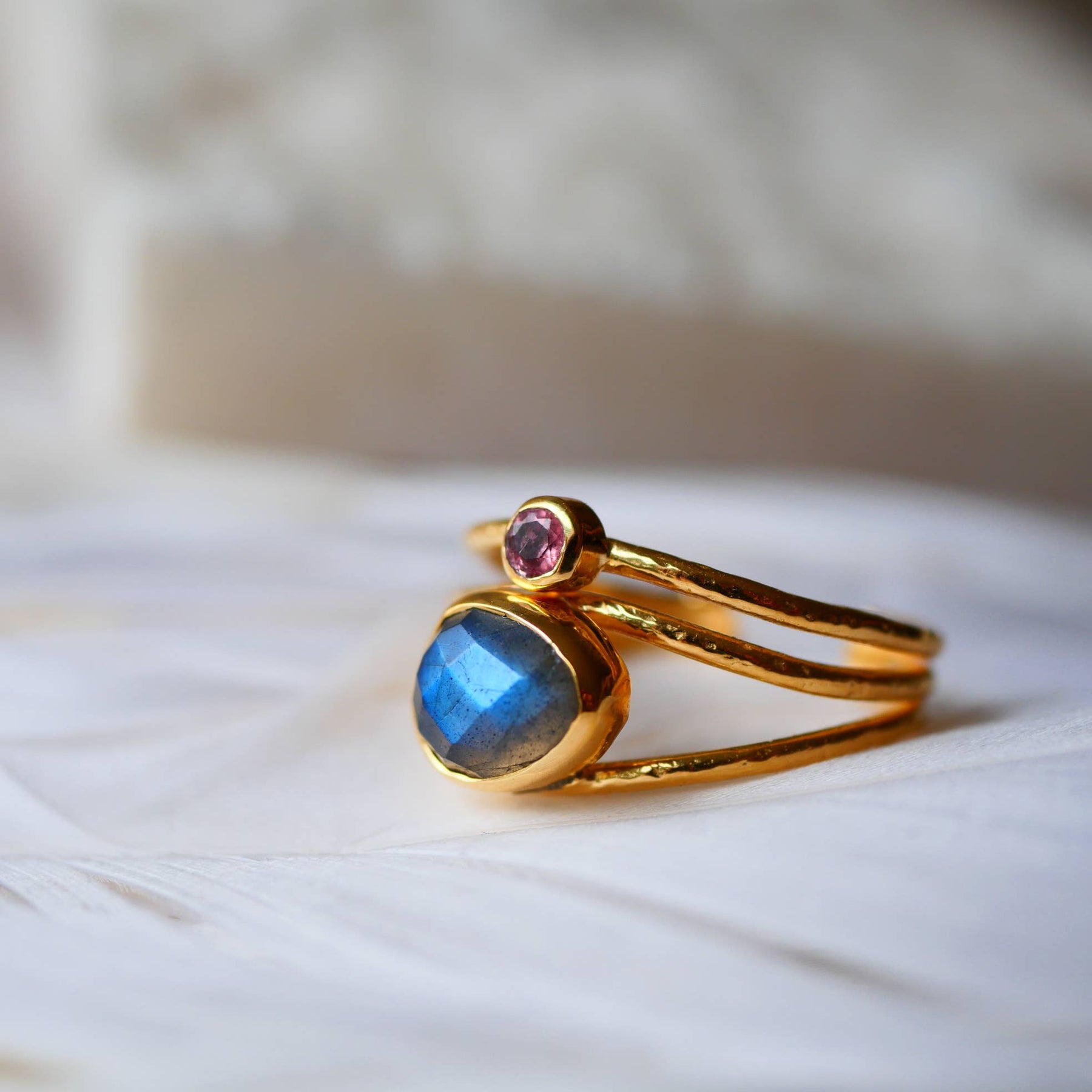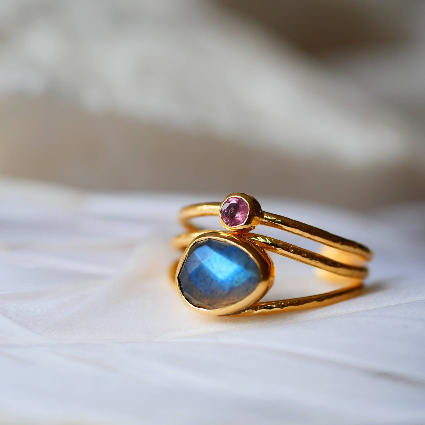 Verstellbarer vergoldeter Ring mit Labradorit & buntem Turmalin – einzigartiger Boho-Schmuck.