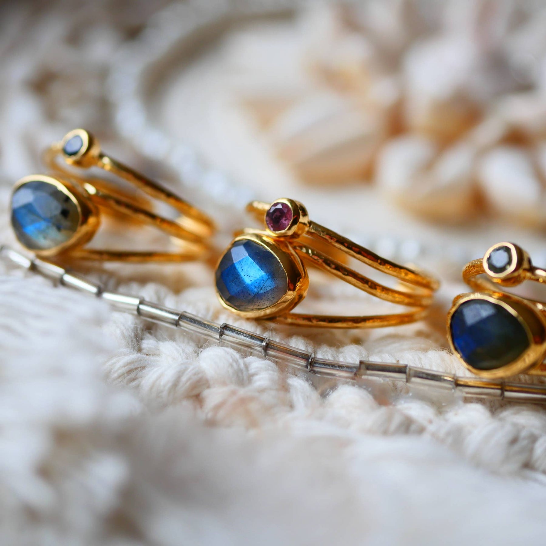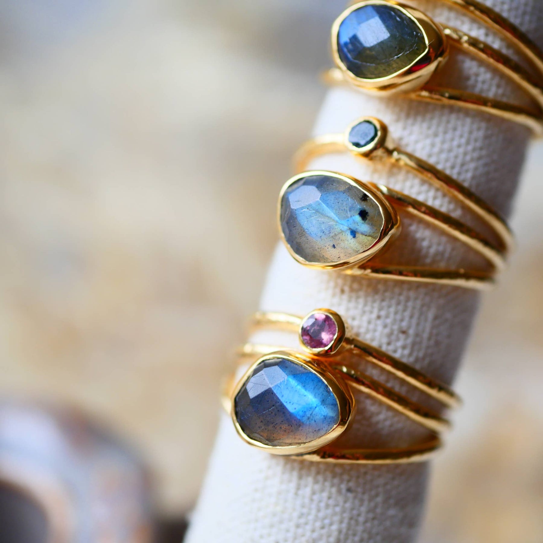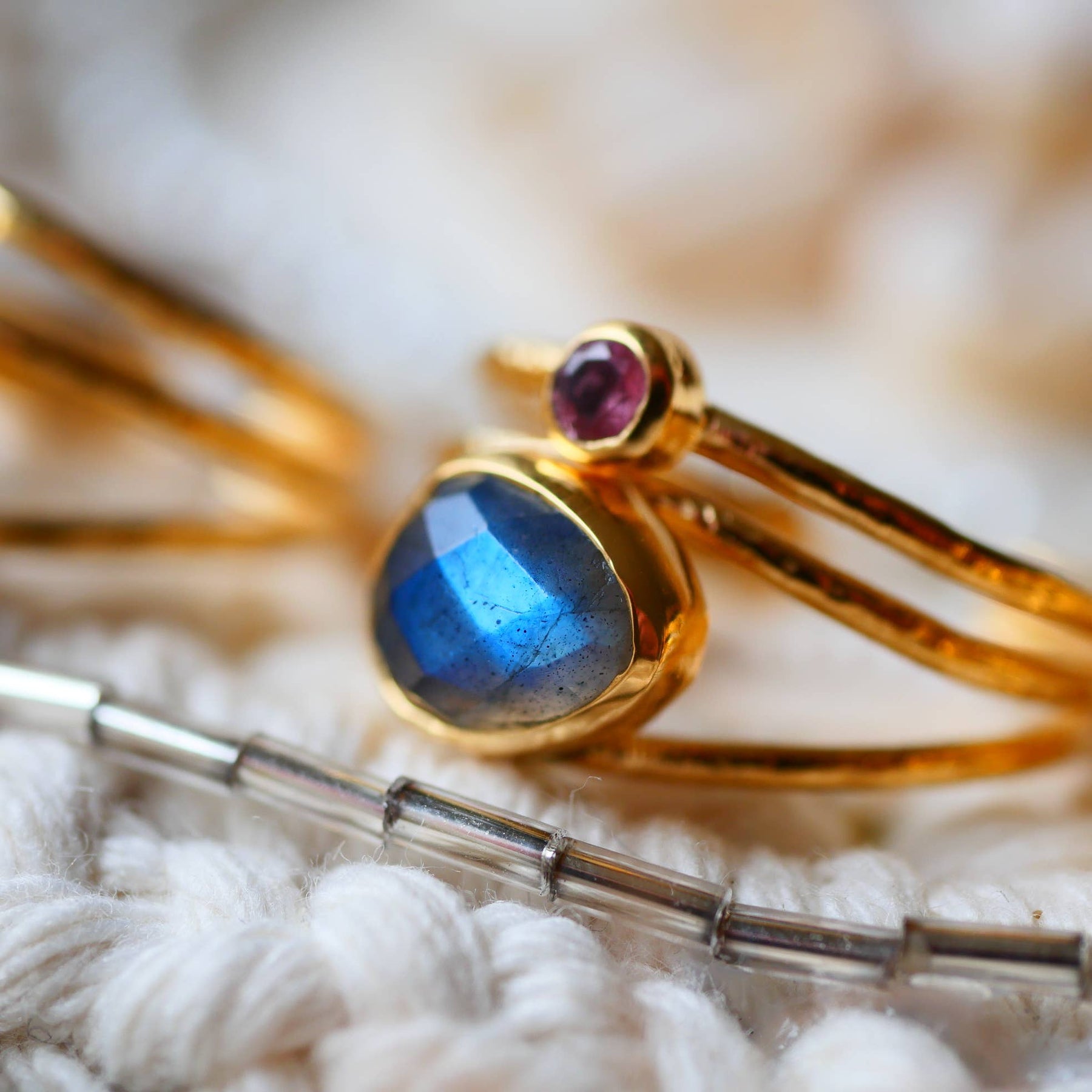 Verstellbarer vergoldeter Ring mit Labradorit & buntem Turmalin – einzigartiger Boho-Schmuck.