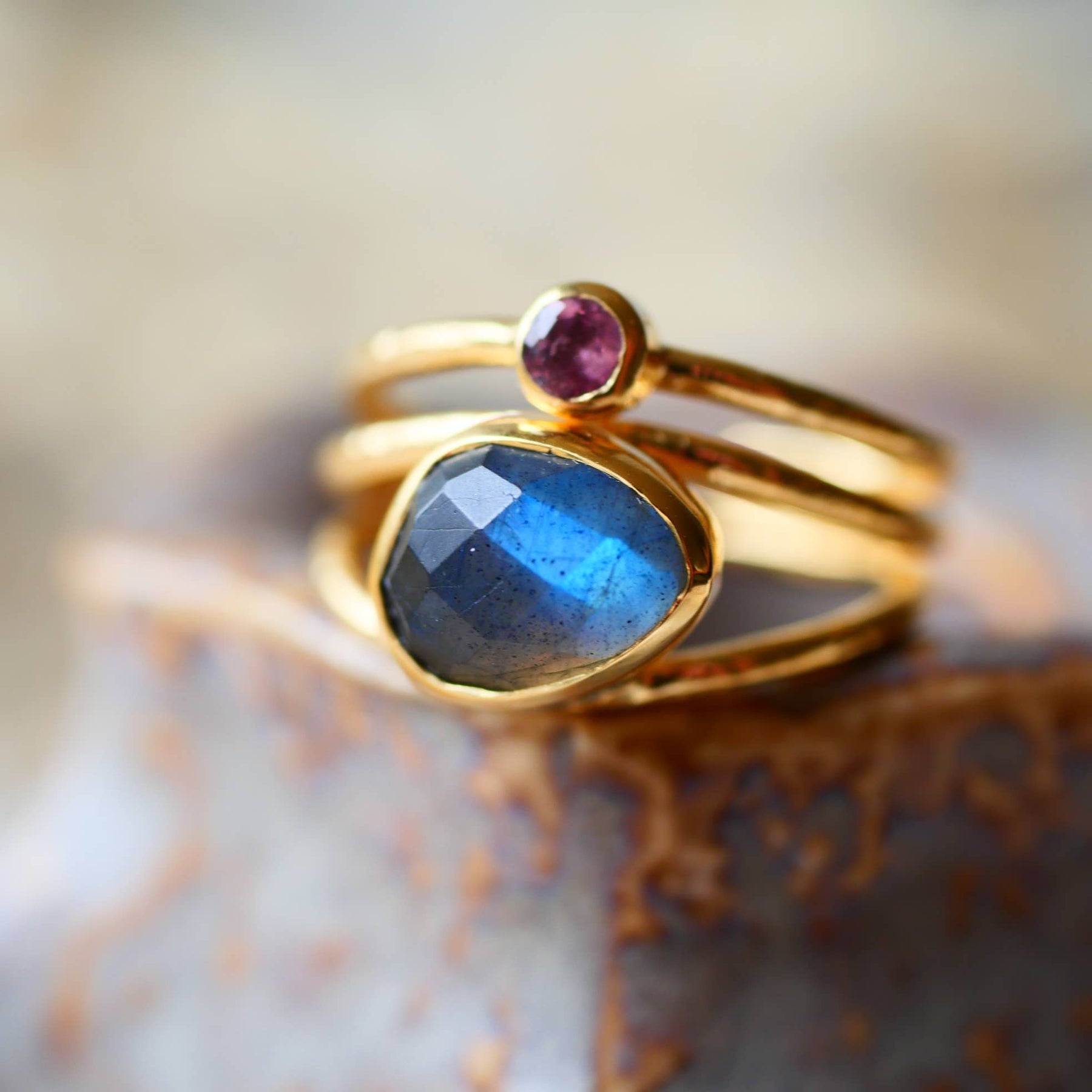 Verstellbarer vergoldeter Ring mit Labradorit & mehrfarbigem Turmalin – Boho-Statement-Schmuck