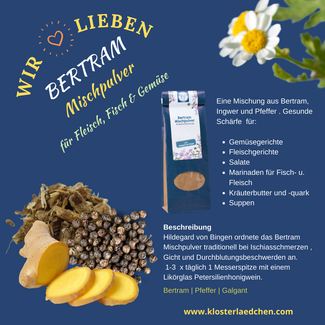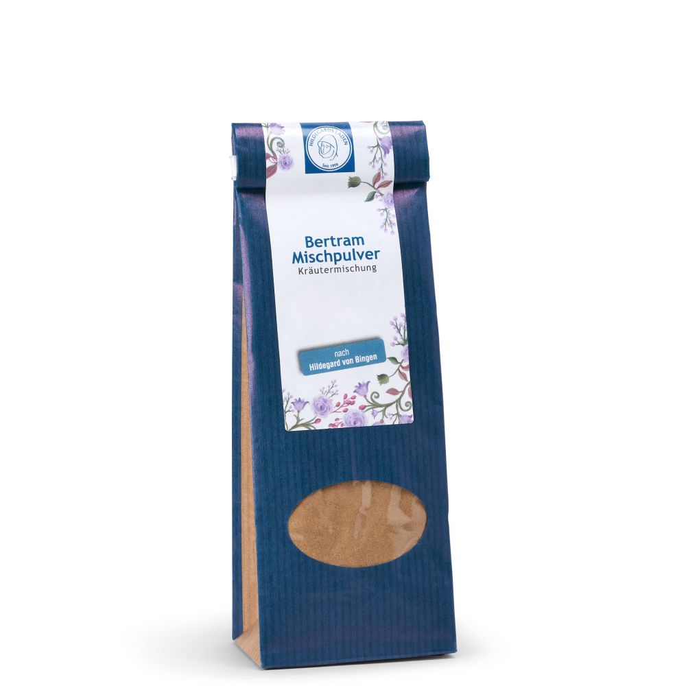 Bertram-Mischpulver nach Hildegard von Bingen – unterstützt die Entschlackung müder Beine und fördert die natürliche Aktivität des Körpers, indem es "schlechte Säfte" reduziert.