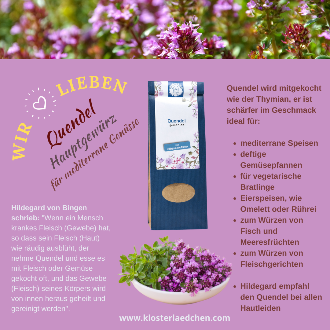 Das Quendelkraut gilt als Universalgewürz in der Hildegard von Bingen Lehre und wird vor allem der Haut zugeschrieben. Das Kraut weist ein angenehm würziges Aroma auf, ist im Geschmack jedoch nicht zu aufdringlich. Einfach zum Mitkochen.