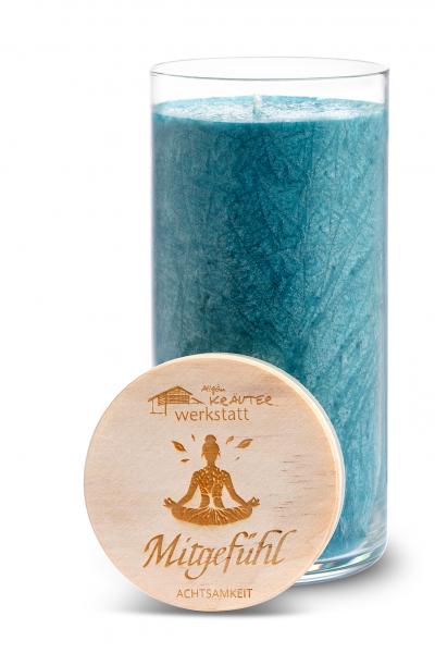 Die Kerze enthält unter anderem Linde, Weißdorn und eine Rosentinktur mit einem mild grünen Duft.
