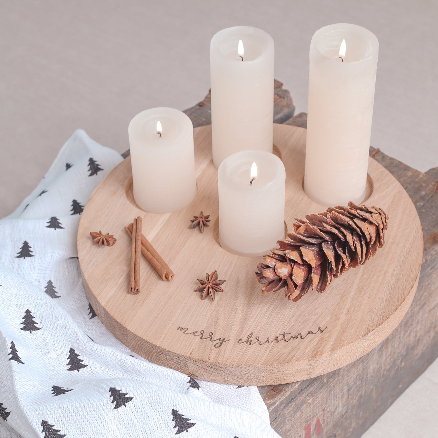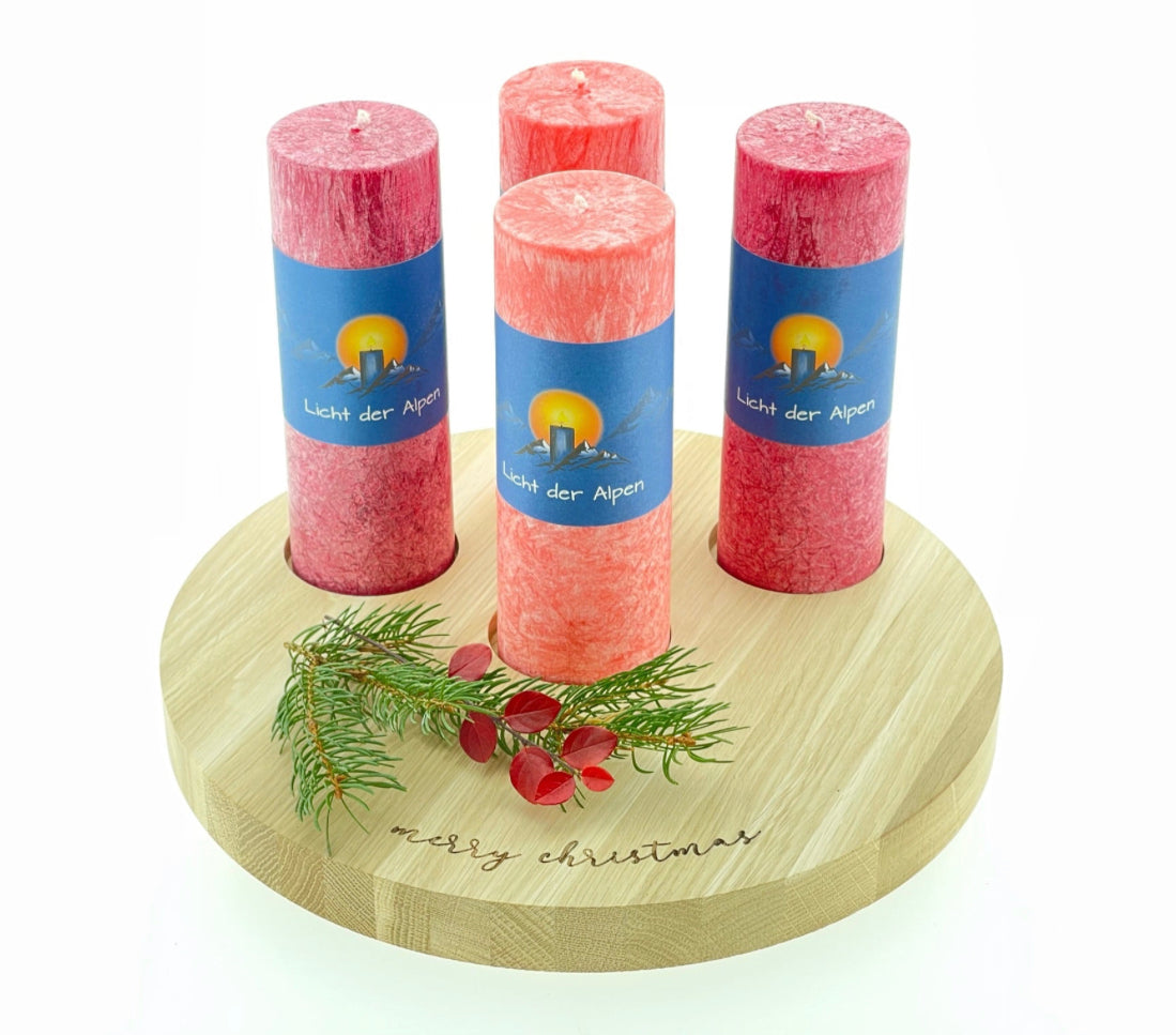 Rundes Kerzenbrett aus Eichenholz gefertigt, Platz für 4 Blockkerzen, Passend für Kerzen mit einem Durchmesser von bis zu 69 mm, Lasergravur auf der Vorderseite