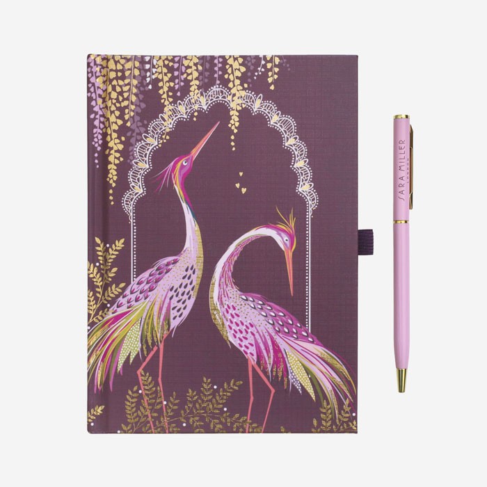 Dieses elegante Kranich Notizbuch mit Stift aus der Haveli Garden Collection von Sara Miller London zeigt stilvolle rosa Kraniche mit einem Schwung exotischer Federn, die vor einem satten Pflaumenhimmel tanzen. Es ist perfekt für tägliche Notizen. Das Set aus Notizbuch und Stift hat die ideale Größe für deine Handtasche und der schlanke blütenrosa Stift ist perfekt, um unterwegs Notizen und Erinnerungen zu notieren.