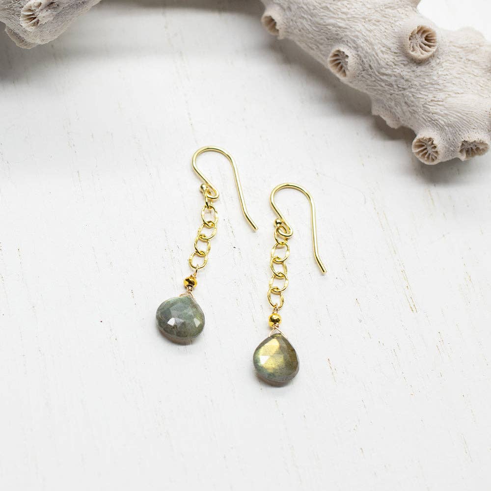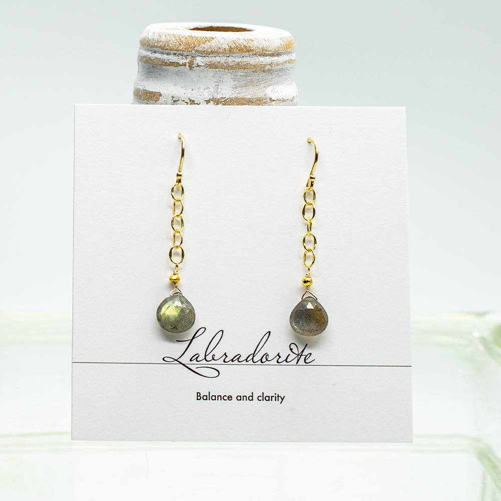 Der Labradorit ist bekannt für seine schillernden Farben und wird als Schutzstein geschätzt, der Intuition und Kreativität fördert. Diese handgefertigten Ohrringe aus Connecticut, USA, sind das perfekte Accessoire für besondere Anlässe – feminin, modern und voller Bedeutung.
