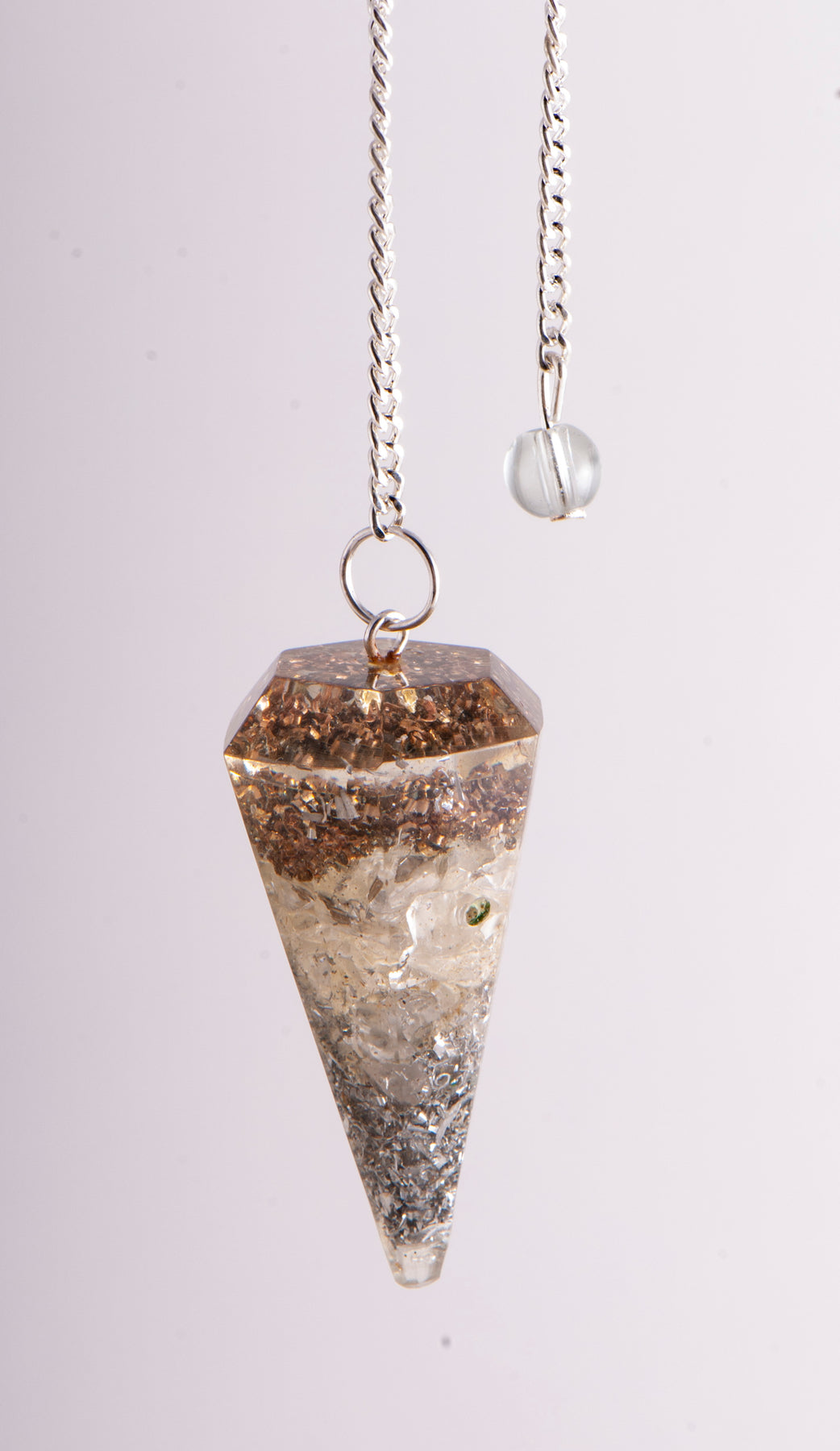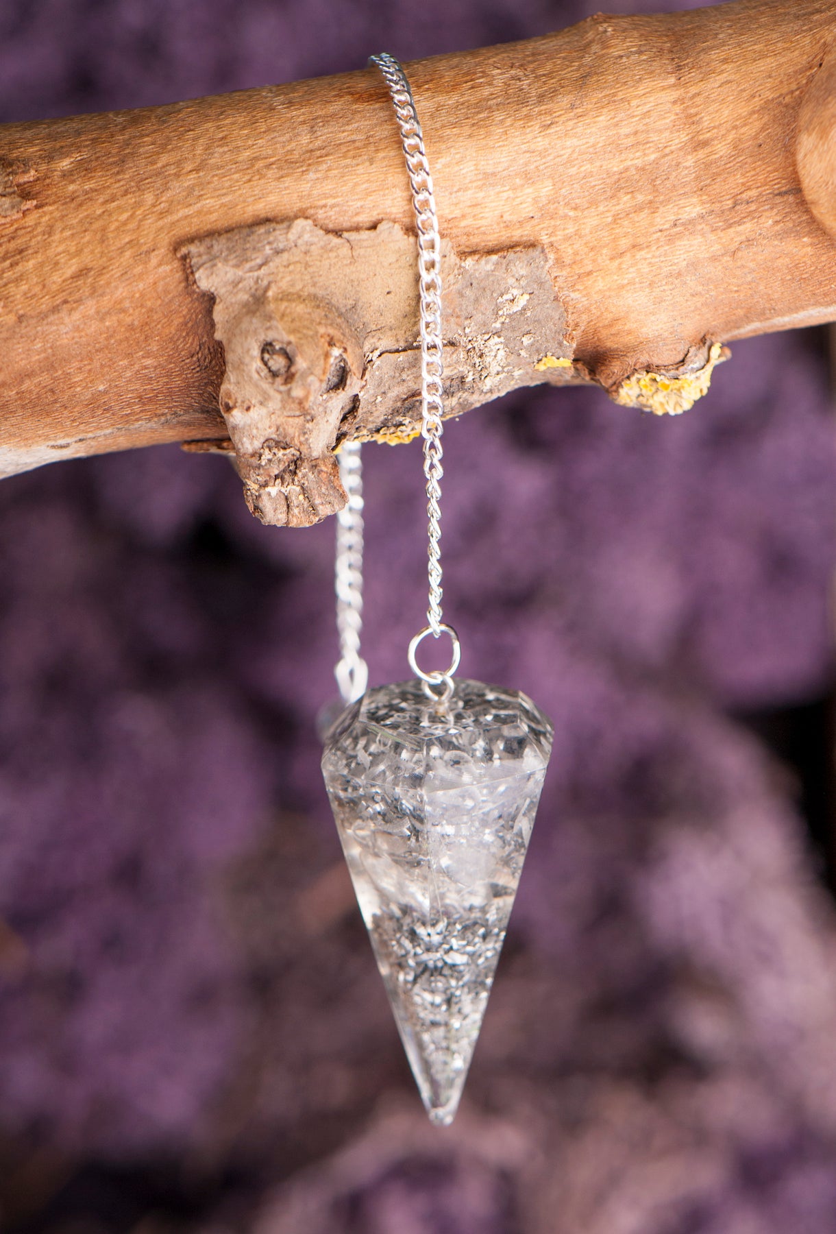 Orgonpendel Bergkristall. Orgon ist pure, vitale Lebensenergie, die überall in der Atmosphäre vorhanden ist. Diese Energie wird durch Harz, Metalle und Kristalle gebündelt. Das verwendete Metall kann variiren. Klarer Quarz (Bergkristall): fördert Klarheit Höhe: ~42 mm