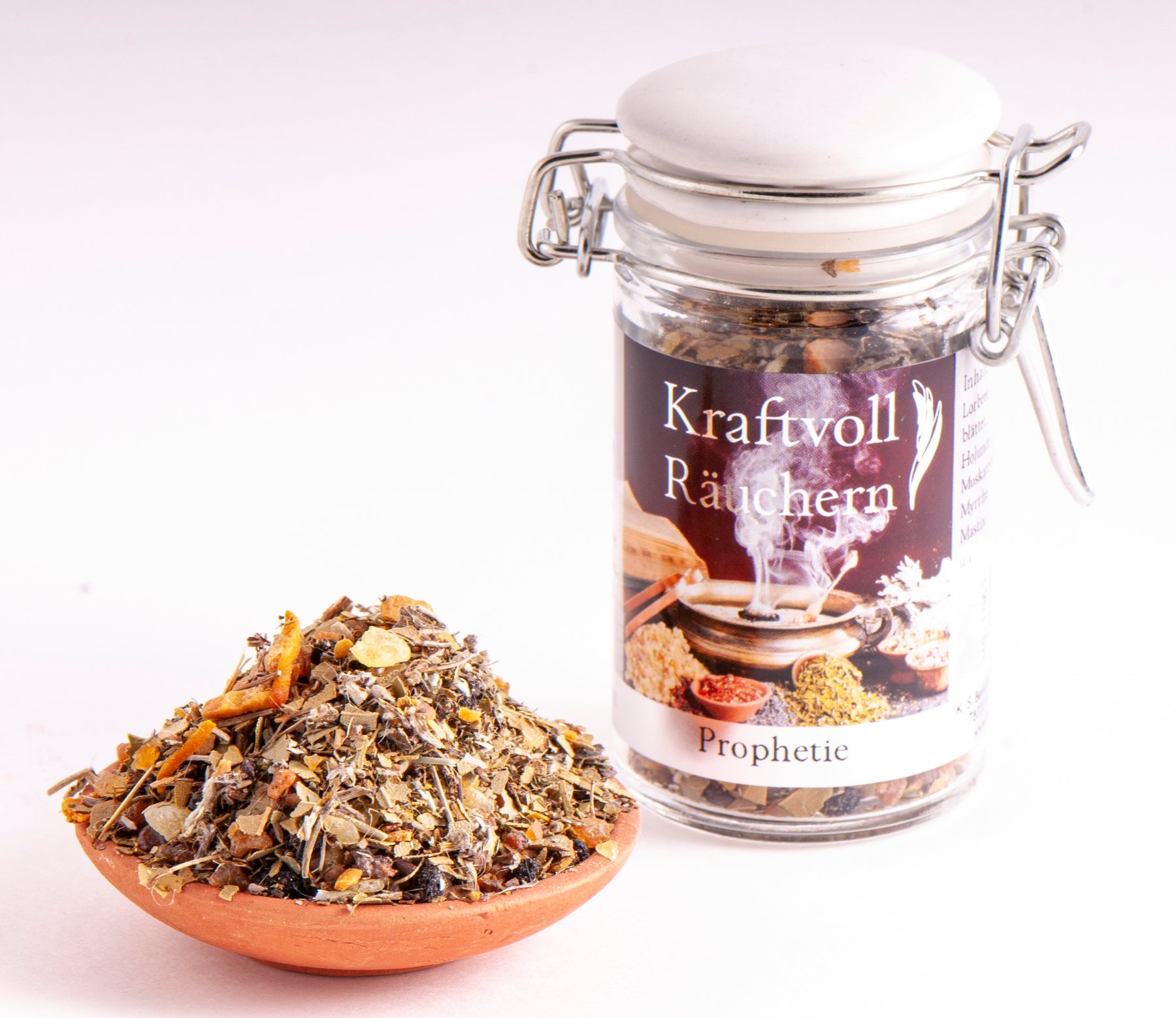 Das original Räucherwerk Prophetie stärkt die Verbindung zu höheren Welten, um Antworten auf unsere Fragen zu bekommen. Ideale Räucherung für eine bewusste Zusammenarbeit mit dem Himmlischen beim Kartenlegen oder Pendeln etc...