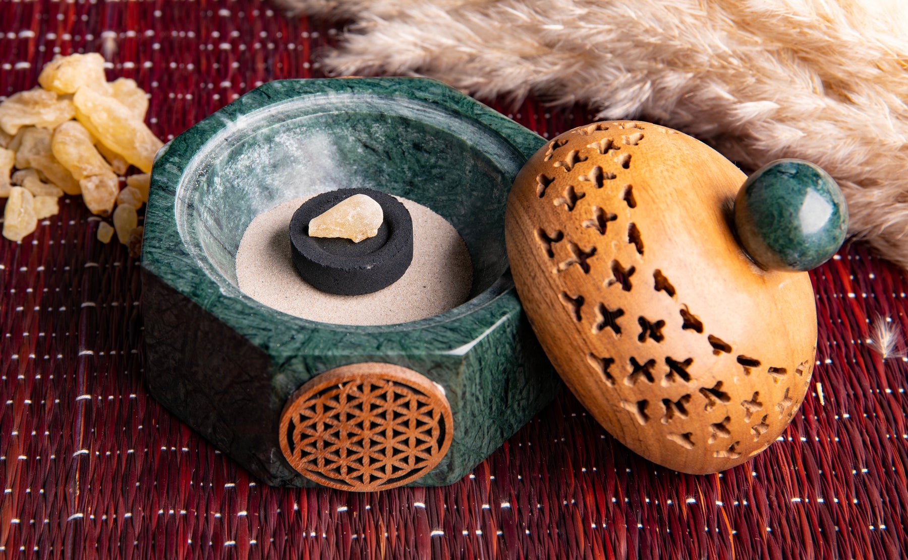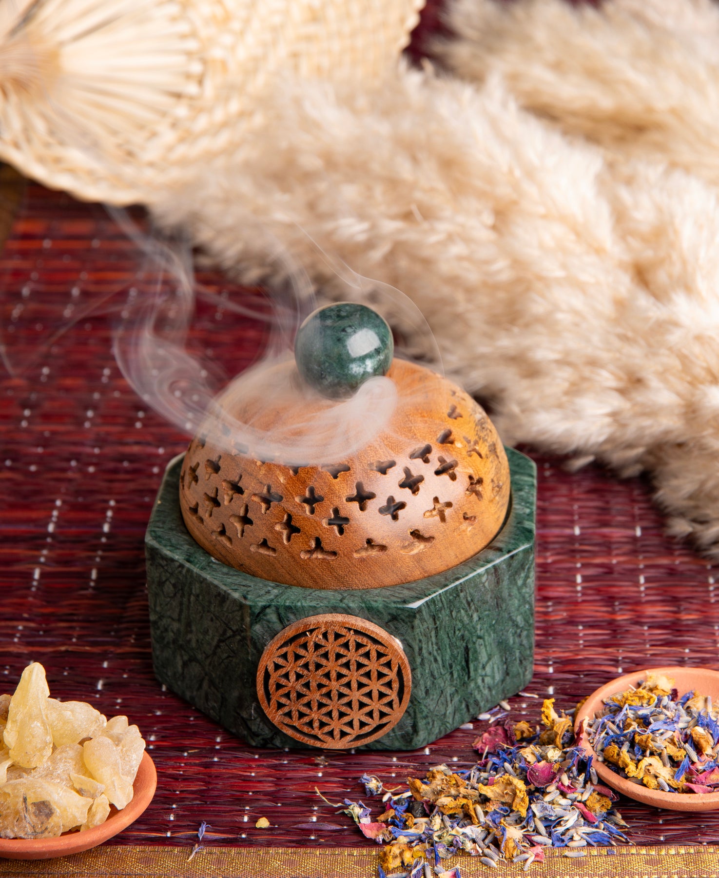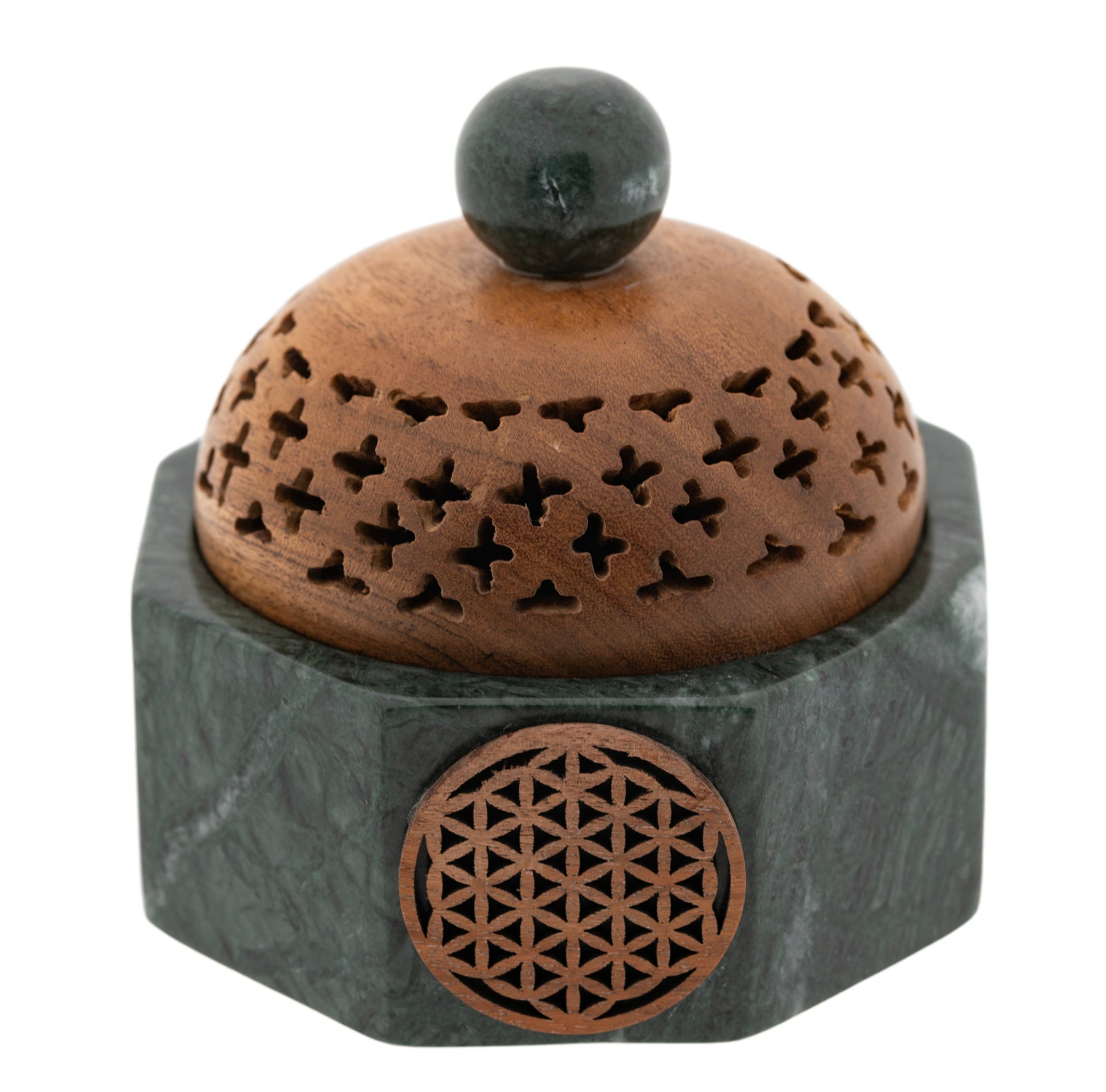 Ein fürstliches Räuchergefäß aus schwerem grünen Marmor. Auf zwei Seiten mit Blume des Lebens Emblem und einem Kuppeldeckel aus Holz mit vielen kleinen Sternchenöffnungen, durch welche die Rauchfahnen empor steigen können. Die hohen Qualität ermöglicht das Räuchern ohne Sand. Es steht kratzschonend auf 4 Gummifüßchen.