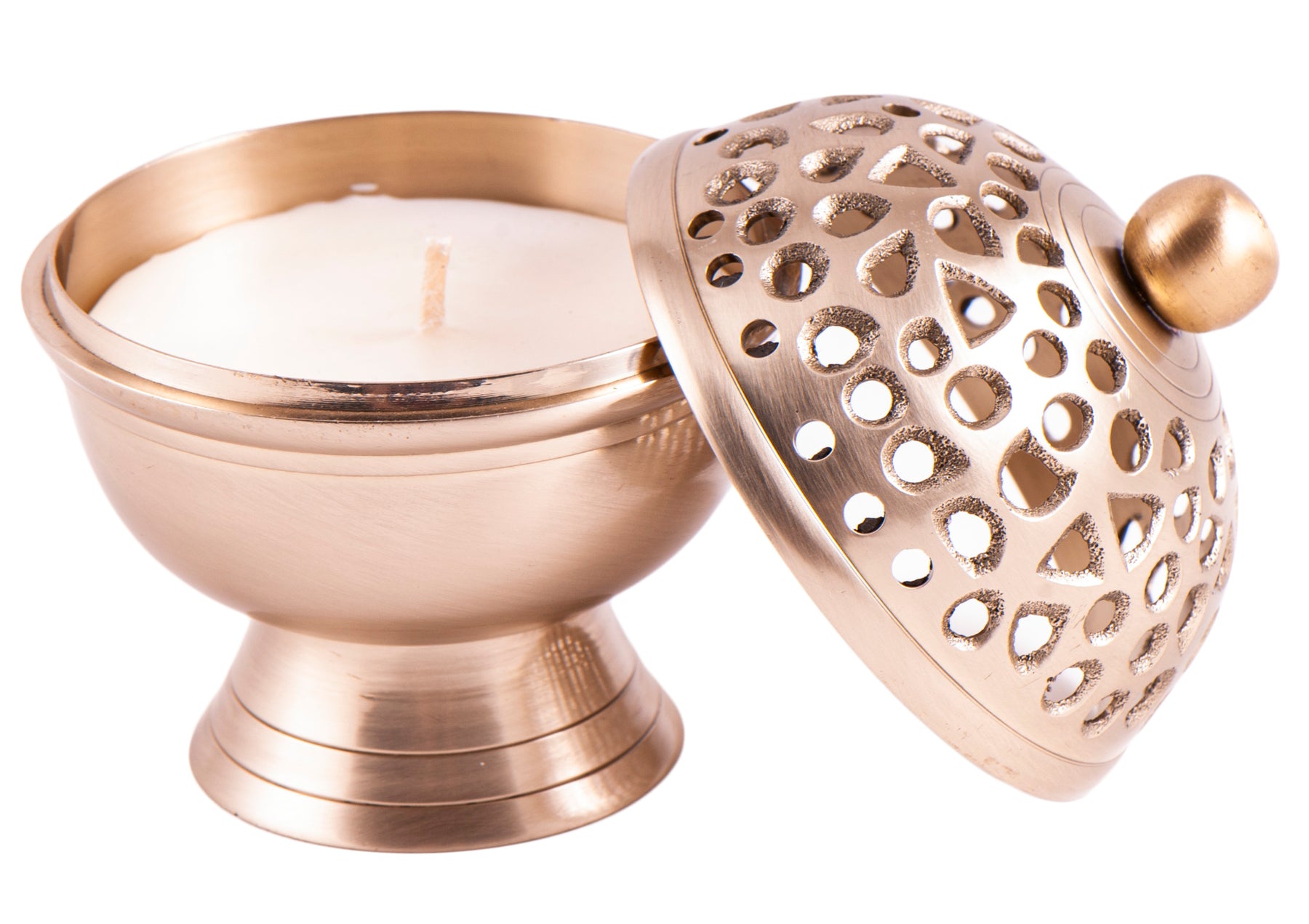 Kerze in süßem, kleinen Messinggefäß mit Deckel.