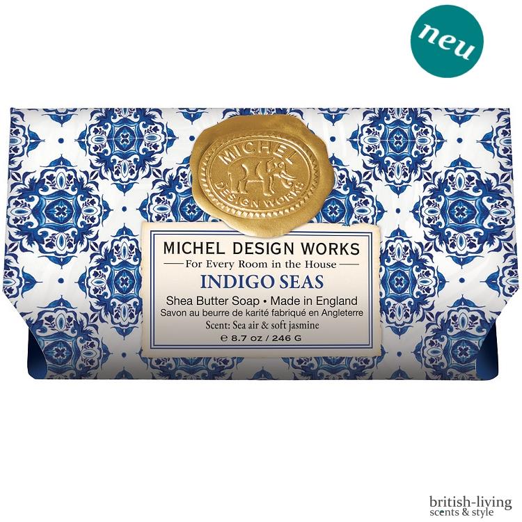 Michel Design Works Badeseife Indigo Seas ist eine luxuriöse, dreifach gemahlene Seife mit einem Gewicht von 246 g, hergestellt in England. Sie kombiniert hochwertige Inhaltsstoffe wie pflanzliches Palmöl, Glycerin und feuchtigkeitsspendende Sheabutter, um ein seidig glattes Hautgefühl zu erzeugen. Der Duft vereint Noten von Meeresbrise, Birne, Jasmin, Alpenveilchen, Veilchen, Zedernholz, Heliotrop und Moschus, was ein erfrischendes und beruhigendes Badeerlebnis schafft. Die Seife eignet sich für alle Hauttypen und ist sowohl für Männer als auch Frauen geeignet.
