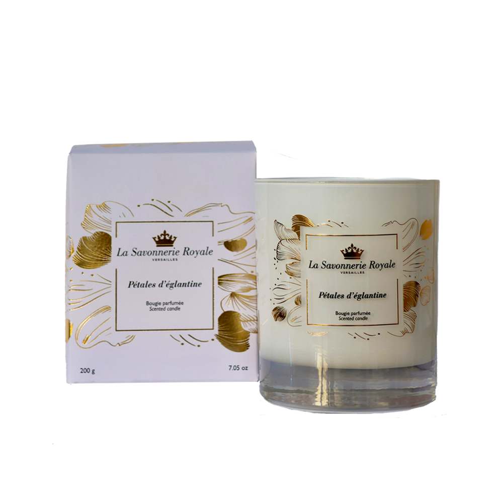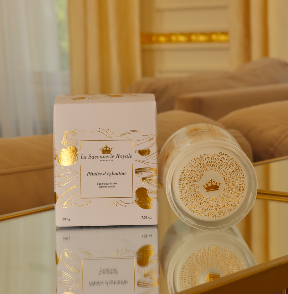 Die Kerzen werden in Zusammenarbeit mit dem historischen Anbieter von Kerzen für die königlichen Familien Europas hergestellt und enthalten außergewöhnliches Pflanzenwachs und bestehen aus Sojaöl, Kokosöl und Mangobutter. Der Duft von Pétales d'Églantine, inspiriert vom Lieblingsduft von Queen Marie-Antoinette, wird Ihr Zuhause mit einem wunderschönen pudrigen Rosenduft verlassen.