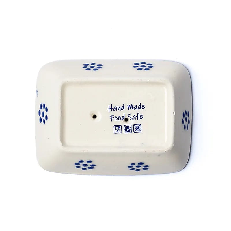 Diese wunderschöne Seifenschale aus Keramik hat zwei Löcher im Boden, damit überschüssiges Wasser einfach ablaufen kann. Sie wurde in der Türkei traditionell gebrannt und von Hand bemalt. Die Bodenfläche passt perfekt für ein Seifenstück von ca. 9 x 6 cm.