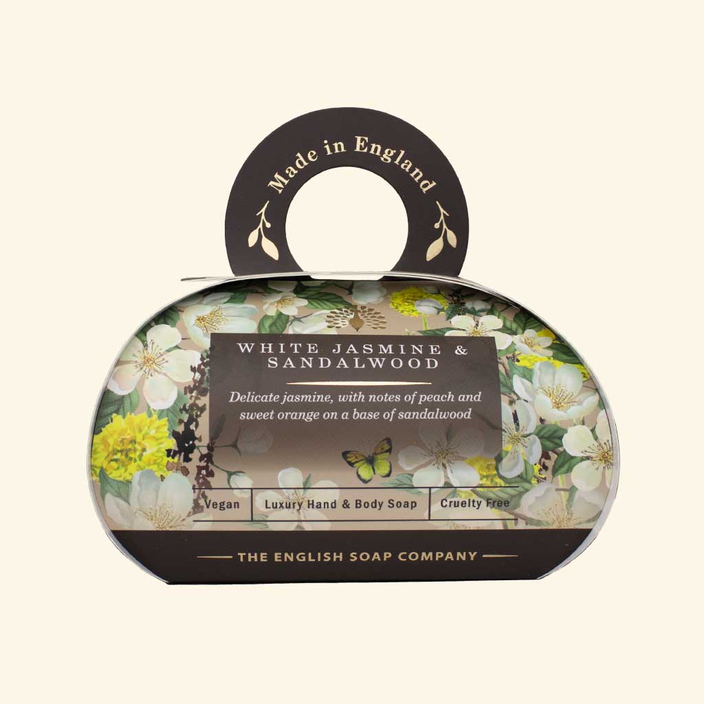 Die White Jasmine and Sandalwood Seife ist in einer schönen Geschenkbox verpackt. Die White Jasmine and Sandalwood Seifen haben eine Kopfnote aus Pfirsich, Mango und süßer Orange. Der Duft entwickelt sich zu einem Herz aus roten Beeren, Kokosnuss und Muguet, gefolgt von einer reichhaltigen Basis aus Jasmin, Veilchen, Sandelholz und Moschus. Angereichert mit feuchtigkeitsspendender Sheabutter und pflanzlichem Glycerin.