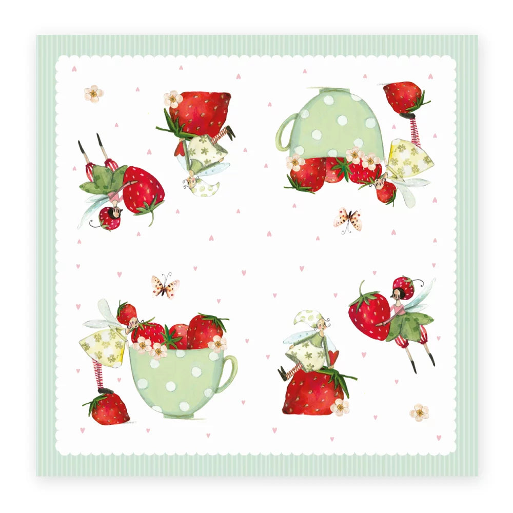 Mit der Cocktailserviette Erdbeeren von Silke Leffler kommt ein frecher Farbklecks zu ihrer Tischdeko. Die Illustration zeigt knallrote Erdbeeren und kleine Blütenelfen. Perfekt für den sommerlich gedeckten Tisch, an dem Sie mit Freunden oder Familie Kaffee trinken und (Erdbeer-)Kuchen essen.