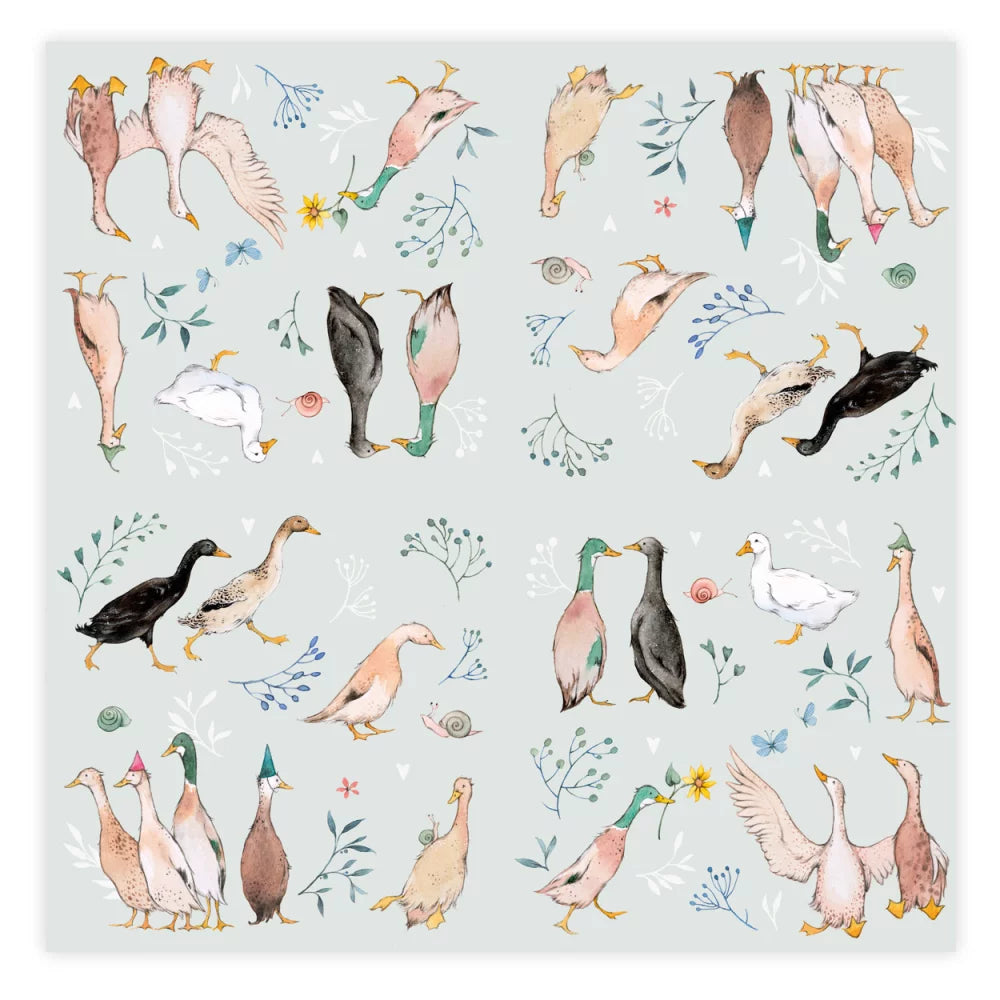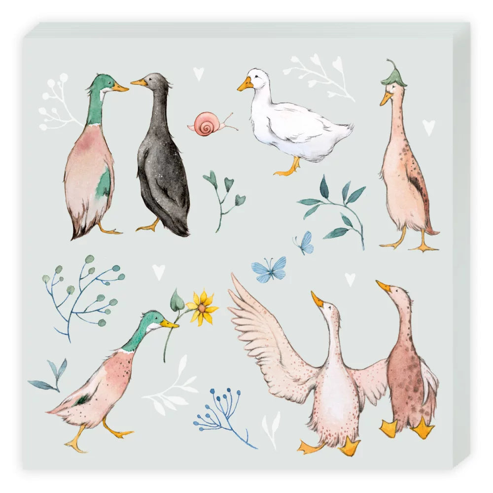 Die Serviette Wiesengeschnatter gehört zur gleichnamigen Designserie von Sophia Drescher. Das lustige Motiv schnatternder Wildenten wird Ihre Tischdeko angenehm aufpeppen und hoffentlich für genauso viel Geschnatter, äh… wir meinen natürlich angeregte Tischgespräche führen.