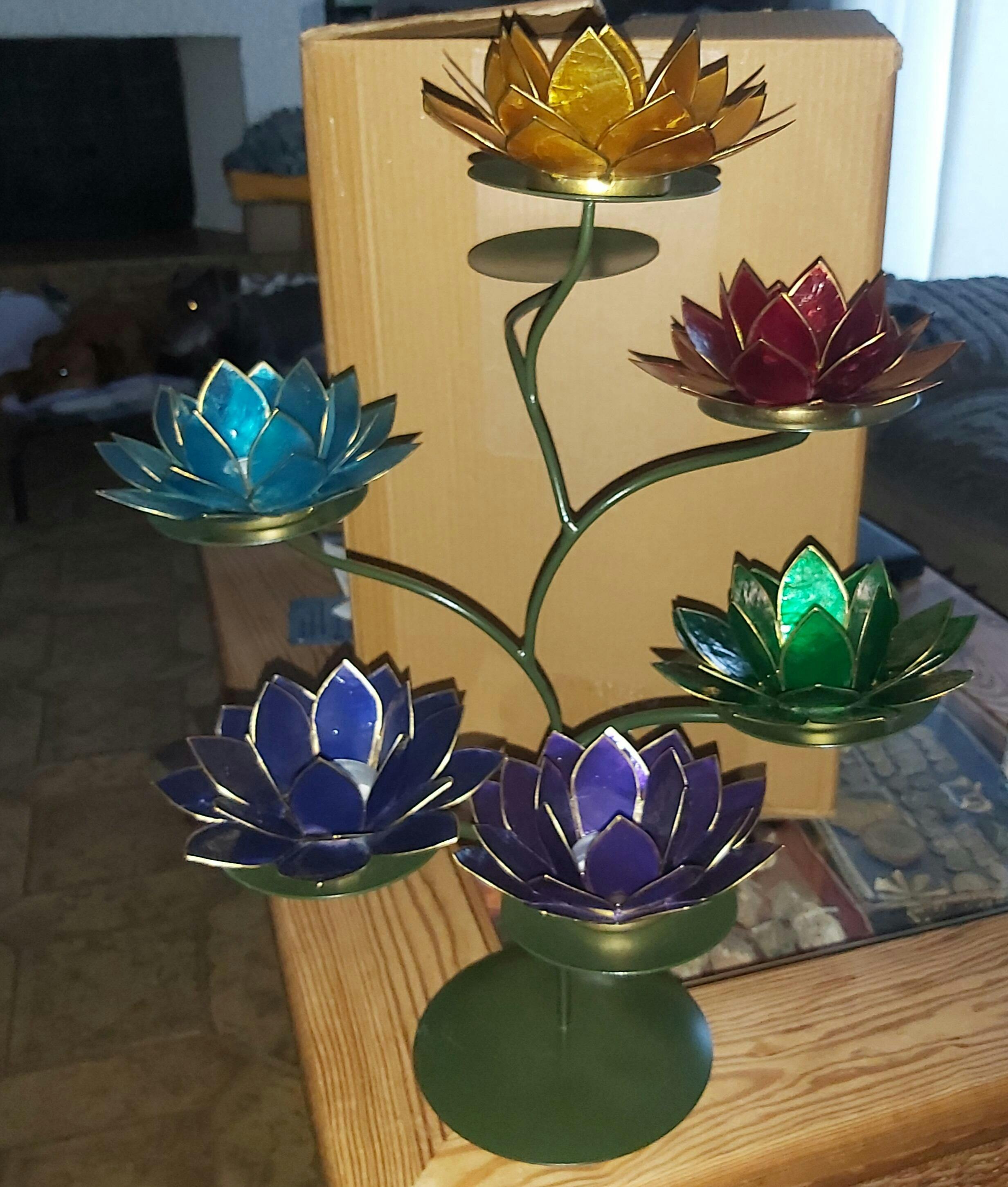 Hinweis: Die Lotus-Kerzenhalter sind nicht im Lieferumfang enthalten und können separat in verschiedenen Farben bestellt werden – einzeln oder als komplettes 7-Chakra-Set.