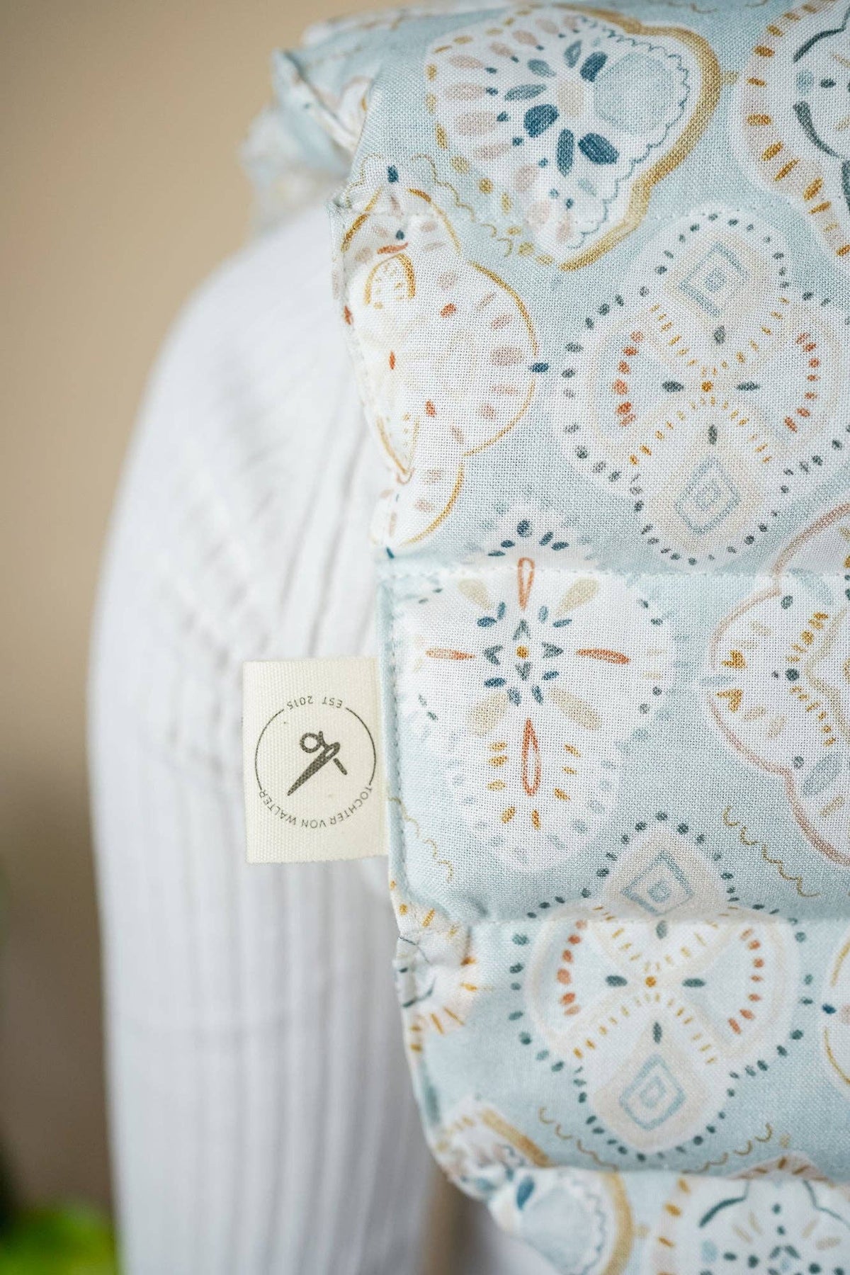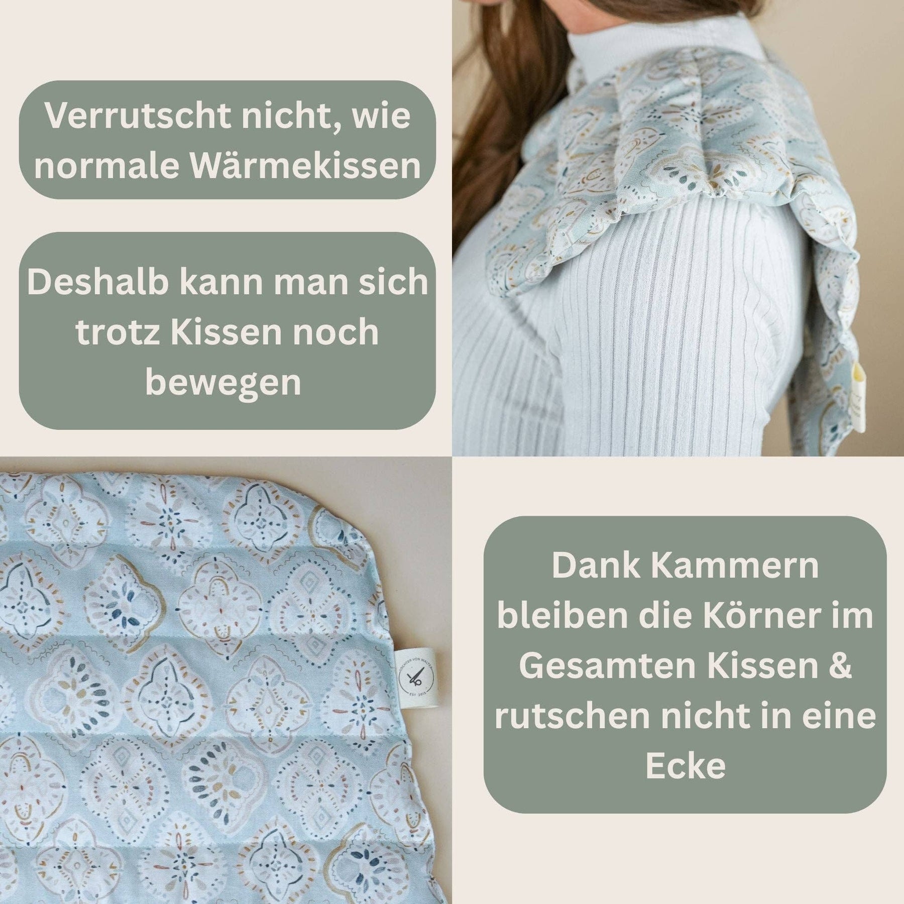 Dank der durchdachten Kammeraufteilung verteilt sich die Wärme gleichmäßig, ohne dass die Körner verrutschen. Die ergonomische Form sorgt dafür, dass das Kissen sicher auf Deinen Schultern liegt – auch wenn Du Dich bewegst, zum Beispiel im Home Office oder auf dem Sofa.