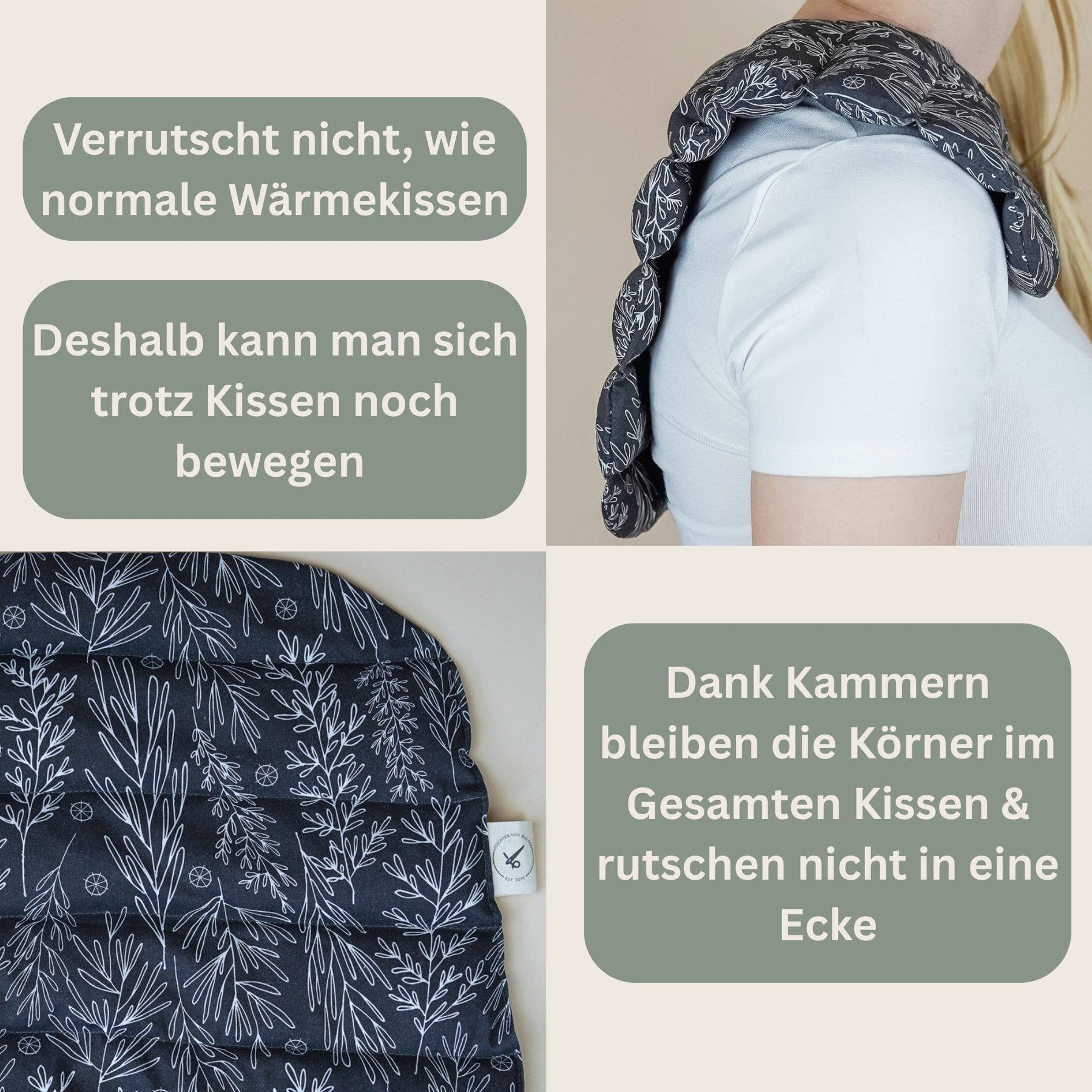 Wohltuende Wärme für Nacken, Schultern & oberen Rücken – bleibt genau dort, wo Du sie brauchst. Dieses Nackenkissen schenkt Dir angenehme Wärme nicht nur für Nacken und Schultern, sondern auch für den oberen Rücken. Die praktische Kammeraufteilung sorgt dafür, dass die Wärme gleichmäßig verteilt wird und die Körner nicht verrutschen. Die ergonomische Schnittform garantiert einen sicheren Halt – so verrutscht das Wärmekissen nicht, selbst wenn Du Dich im Home Office oder unterwegs bewegst.