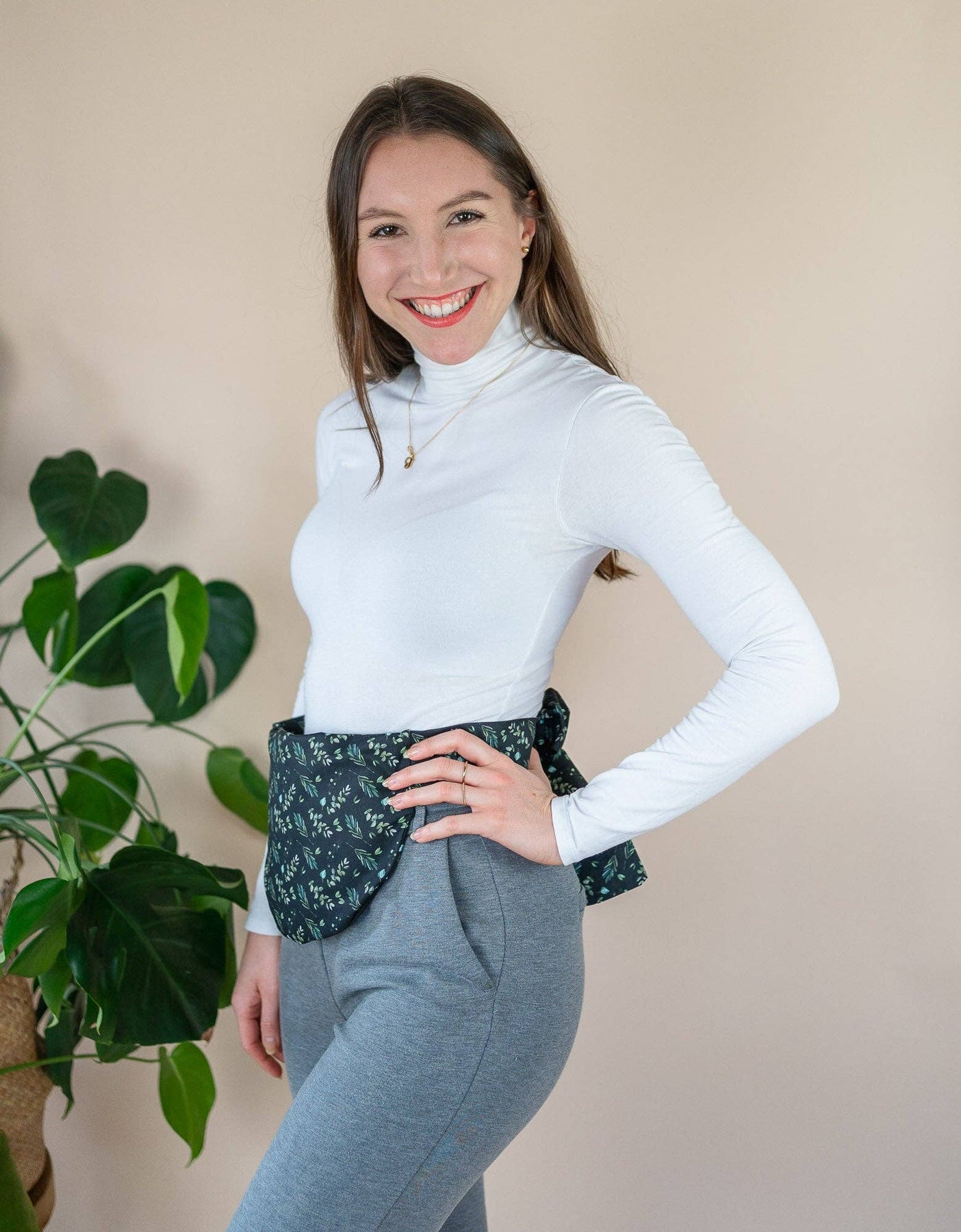Einfach um die Taille binden und frei bewegen: beim Arbeiten im Home Office, beim Einkaufen, beim Spazierengehen oder sogar beim Yoga. Dein Bauch wird sanft umschlossen, während du dich ganz dem Leben widmen kannst.