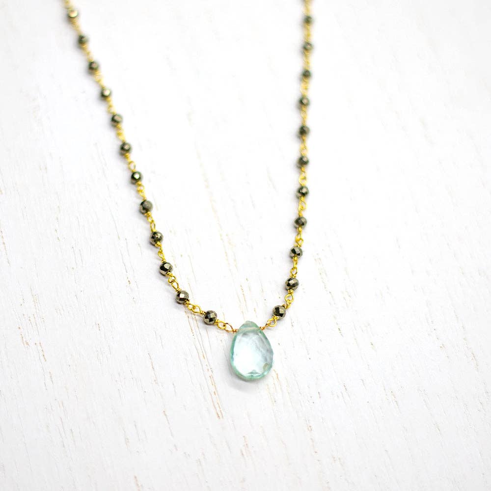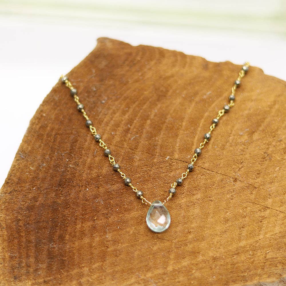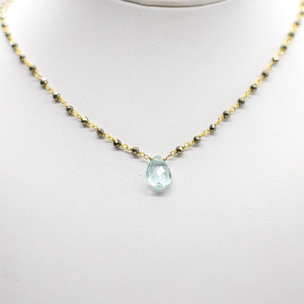 Unsere wunderschöne Wasserfall-Halskette besteht aus einem zarten Aquamarinstein in Tropfenform auf einer Pyrit-Perlenkette.