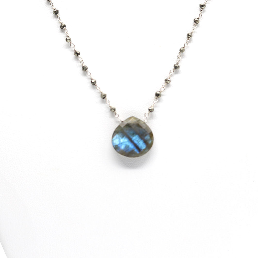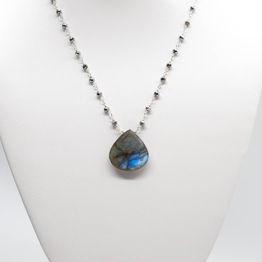 Der Labradorit ist bekannt für seine schillernden Farben und gilt als Schutzstein, der Intuition und Kreativität fördert. Ein idealer Begleiter für Momente, in denen du deine innere Stärke und Ausstrahlung spüren möchtest. Handgefertigt in Connecticut, USA – ein echtes Unikat voller Anmut und Energie.