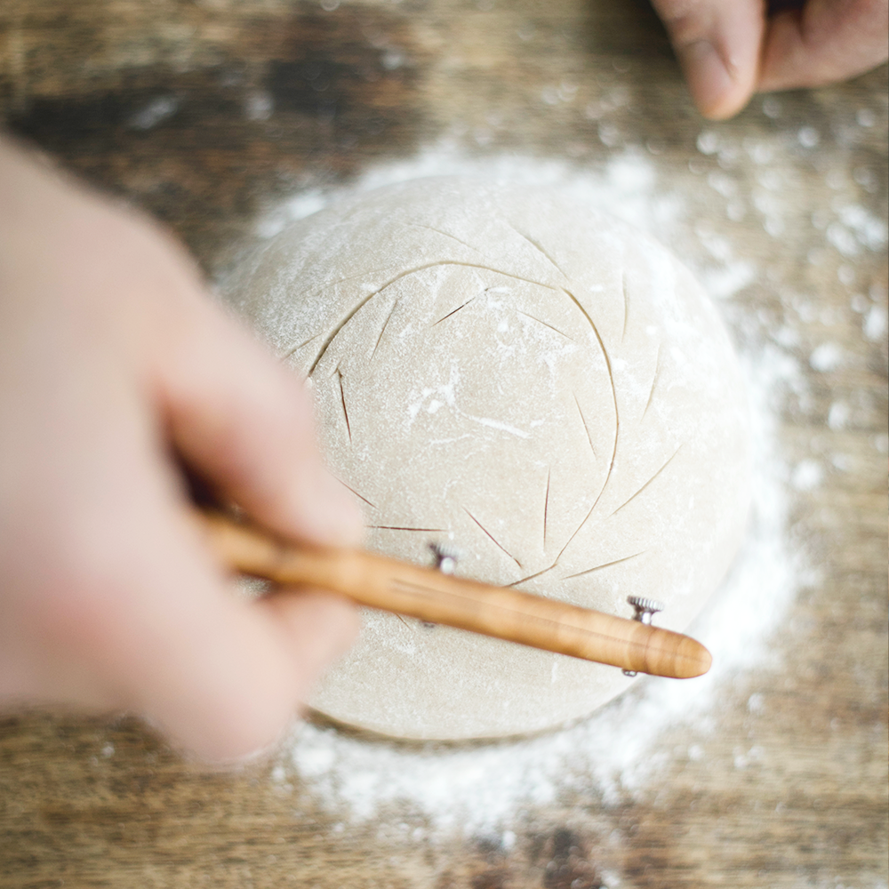 - Schneide den Teig mit einem scharfen Messer oder einer scharfen Klinge oben ein.