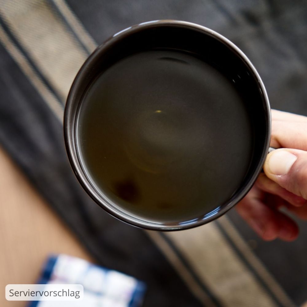 Überbrühen Sie 1 bis 2 Teelöffel mit ca. 250 ml kochendem Wasser und lassen Sie den Tee 5 bis 10 Minuten ziehen.