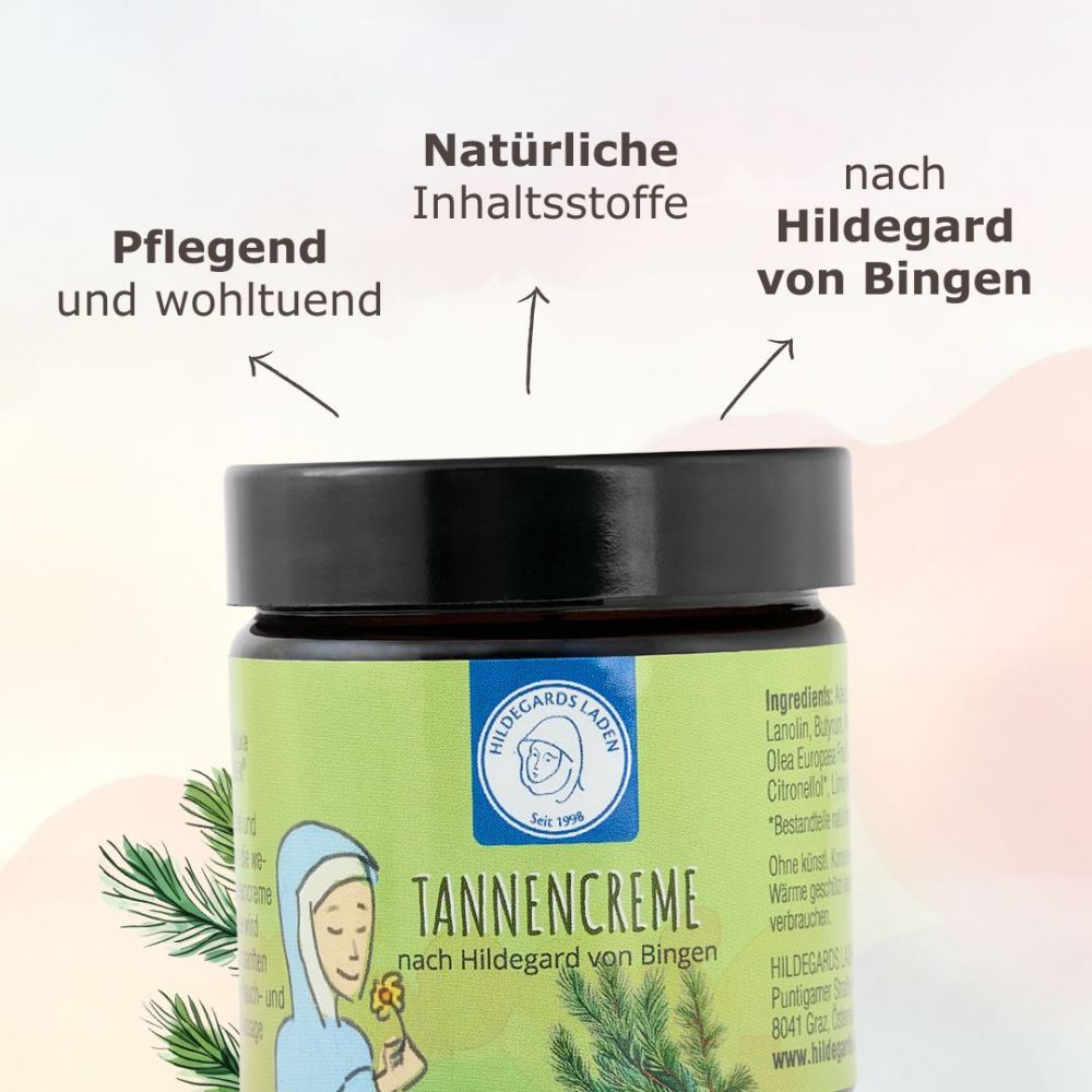 Das Öl der Tannennadeln, Salbei und etwas Butter bilden gemeinsam die wesentlichen Bestandeile der Tannencreme nach der Originalrezeptur von Hildegard von Bingen. Diese wird nach Hildegard von Bingen zur sanften Tiefenmassage, besonders im Bauch- und Seitenbereich aber auch zur Massage der Schläfen empfohlen.